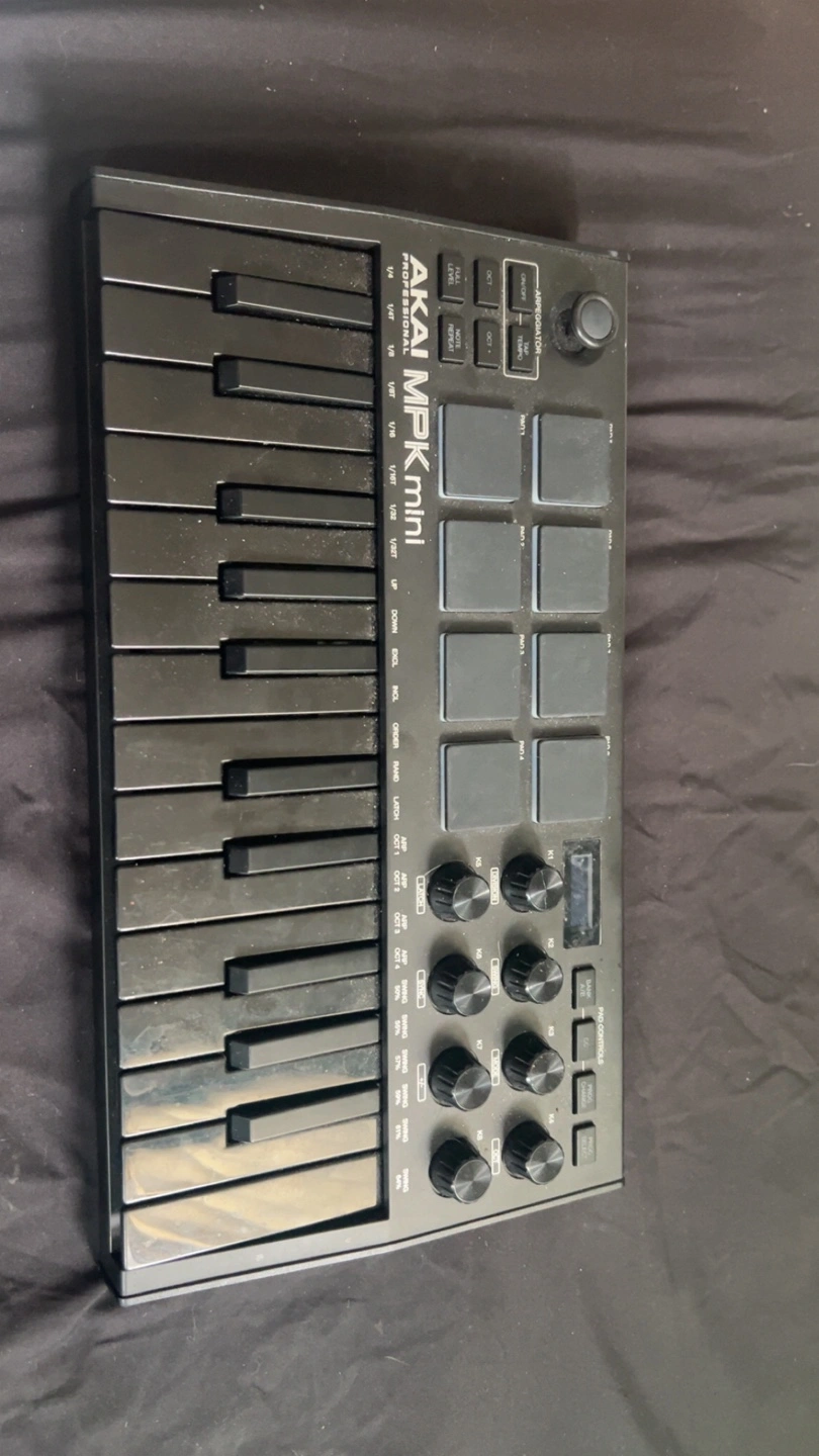 Compact MIDI keyboard controller. Features mini keys, pads, and knobs. Great for music production and performance. USB powered.