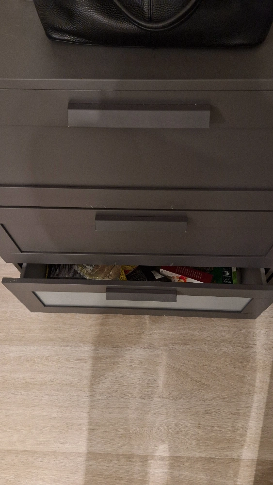 Three-drawer dresser, dark grey colour. Plywood construction. Some minor wear and tear. Perfect for bedroom or closet storage.