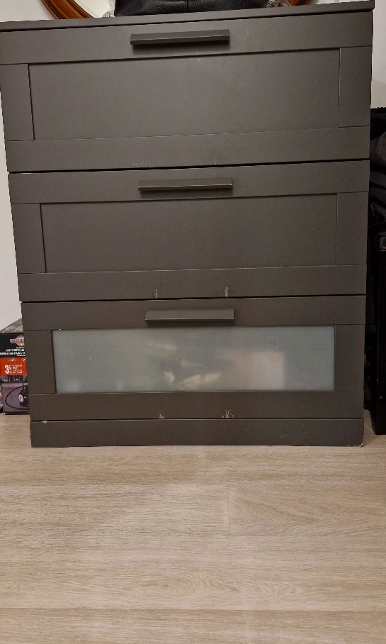 Three-drawer dresser, dark grey colour. Plywood construction. Some minor wear and tear. Perfect for bedroom or closet storage.