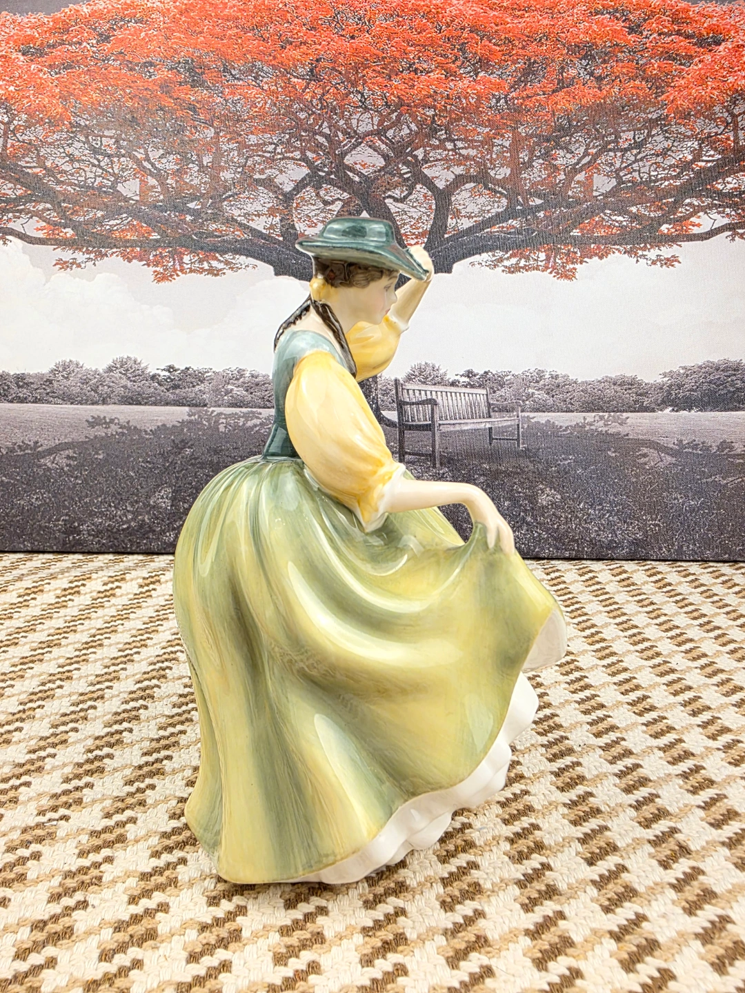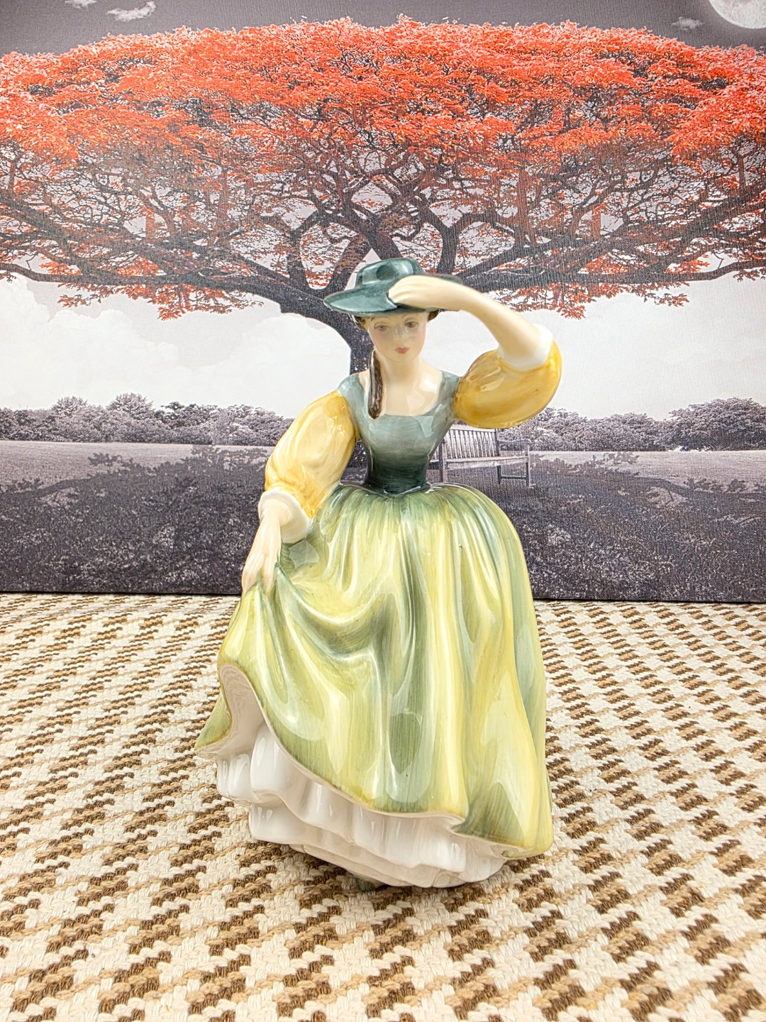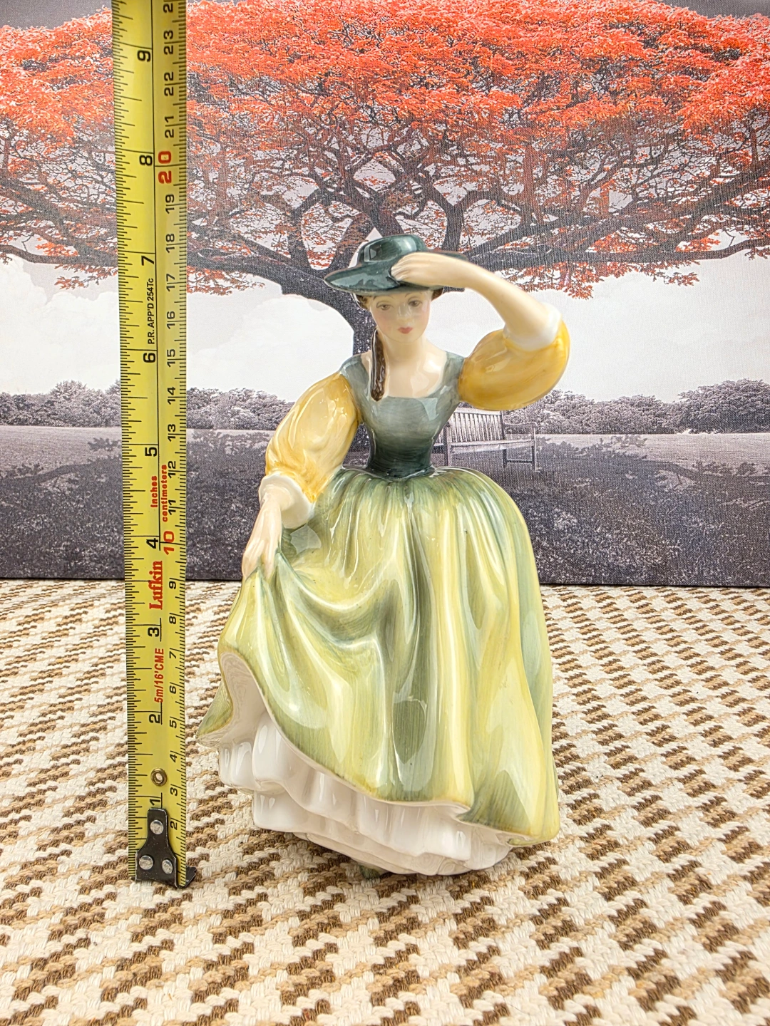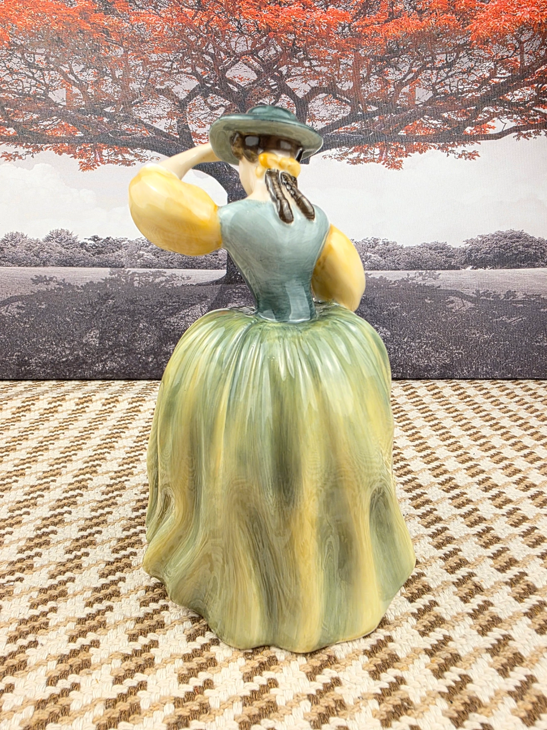 Collectible porcelain figurine. Depicts a lady in a long green dress and hat. Excellent detail and colouring. Approximately 7 inches tall.