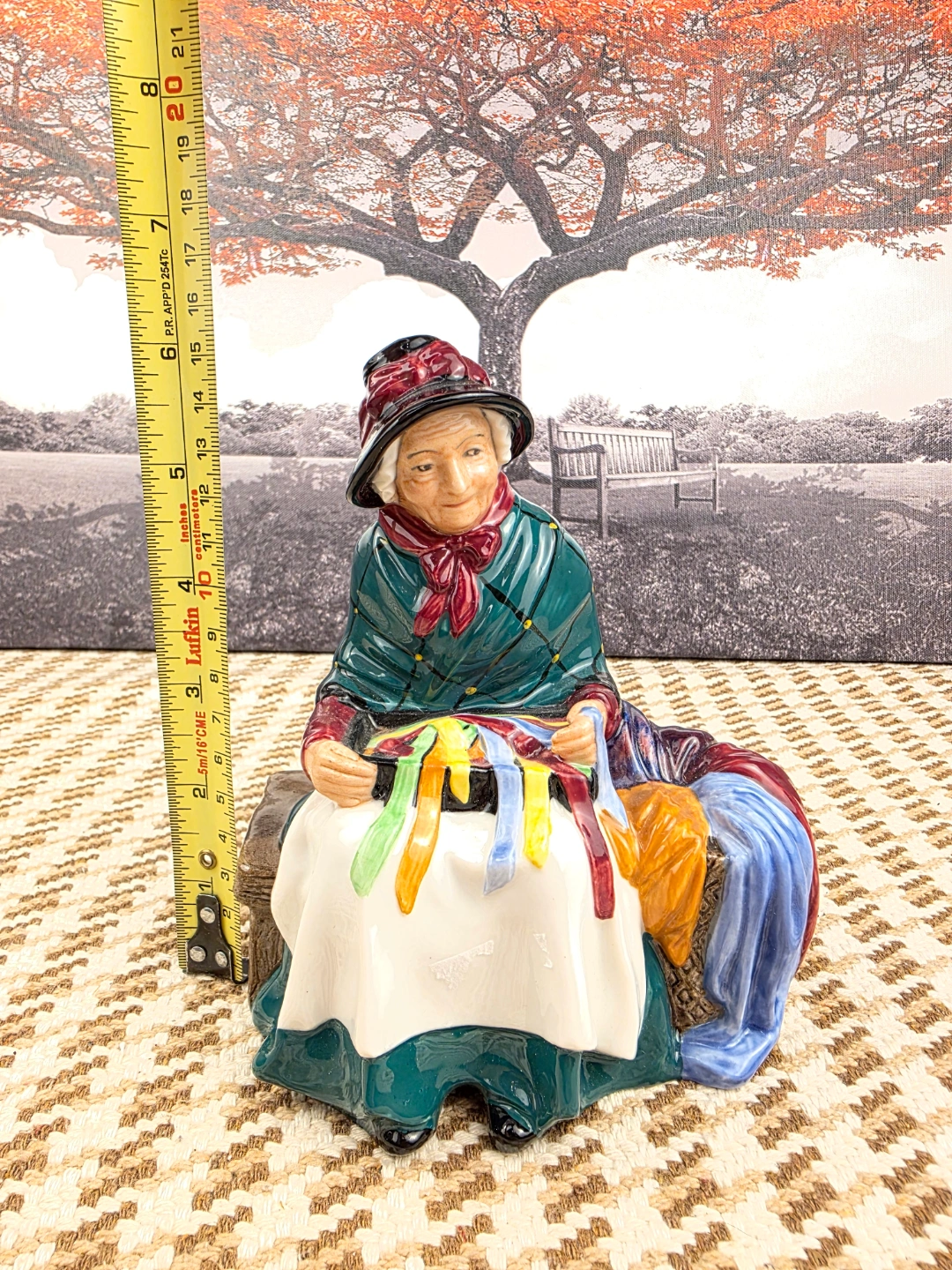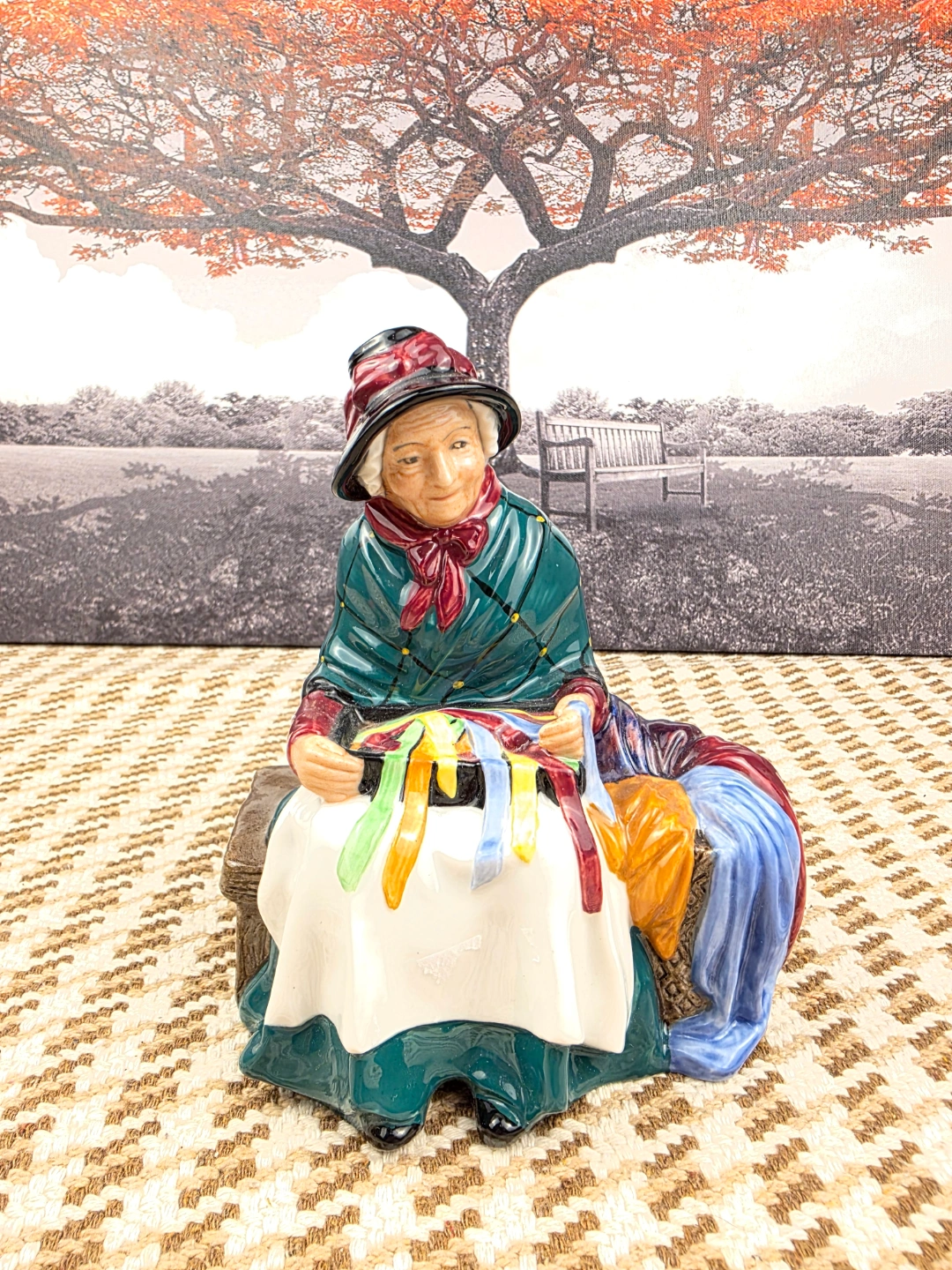 Royal Doulton figurine. Depicts an elderly woman seated on a bench, selling ribbons. Hand-painted and detailed. Collectible item. Approximately 6 inches tall.