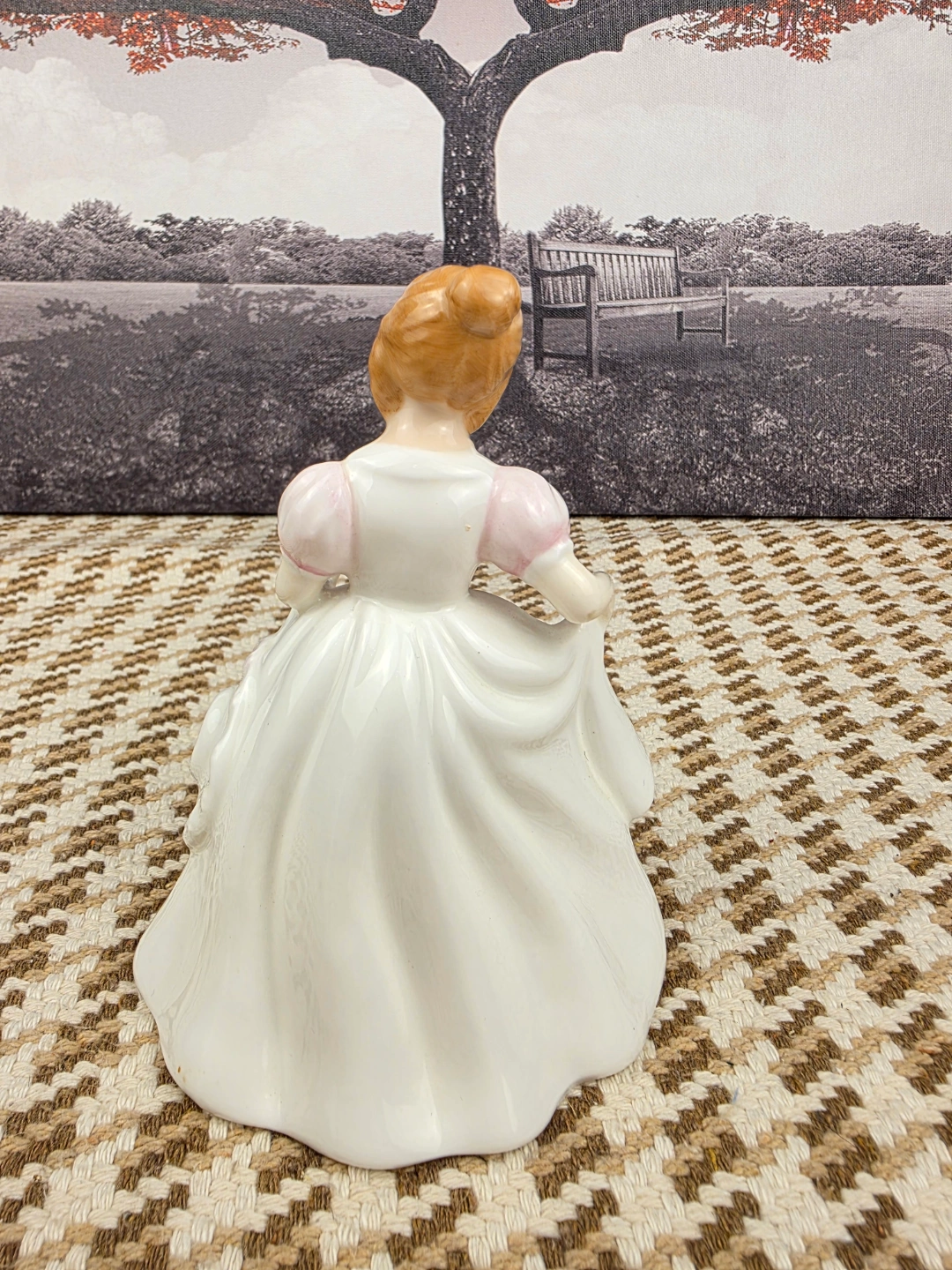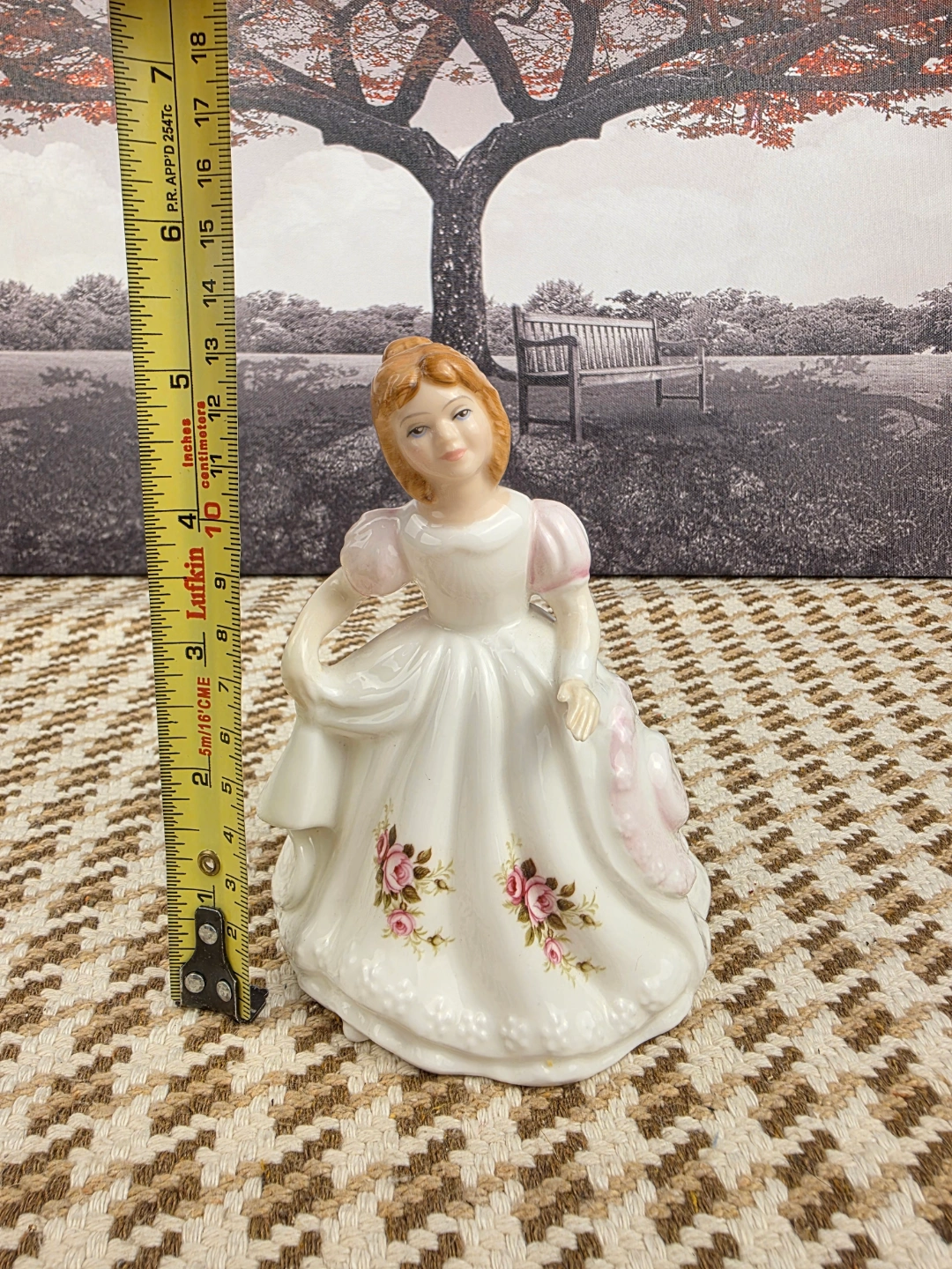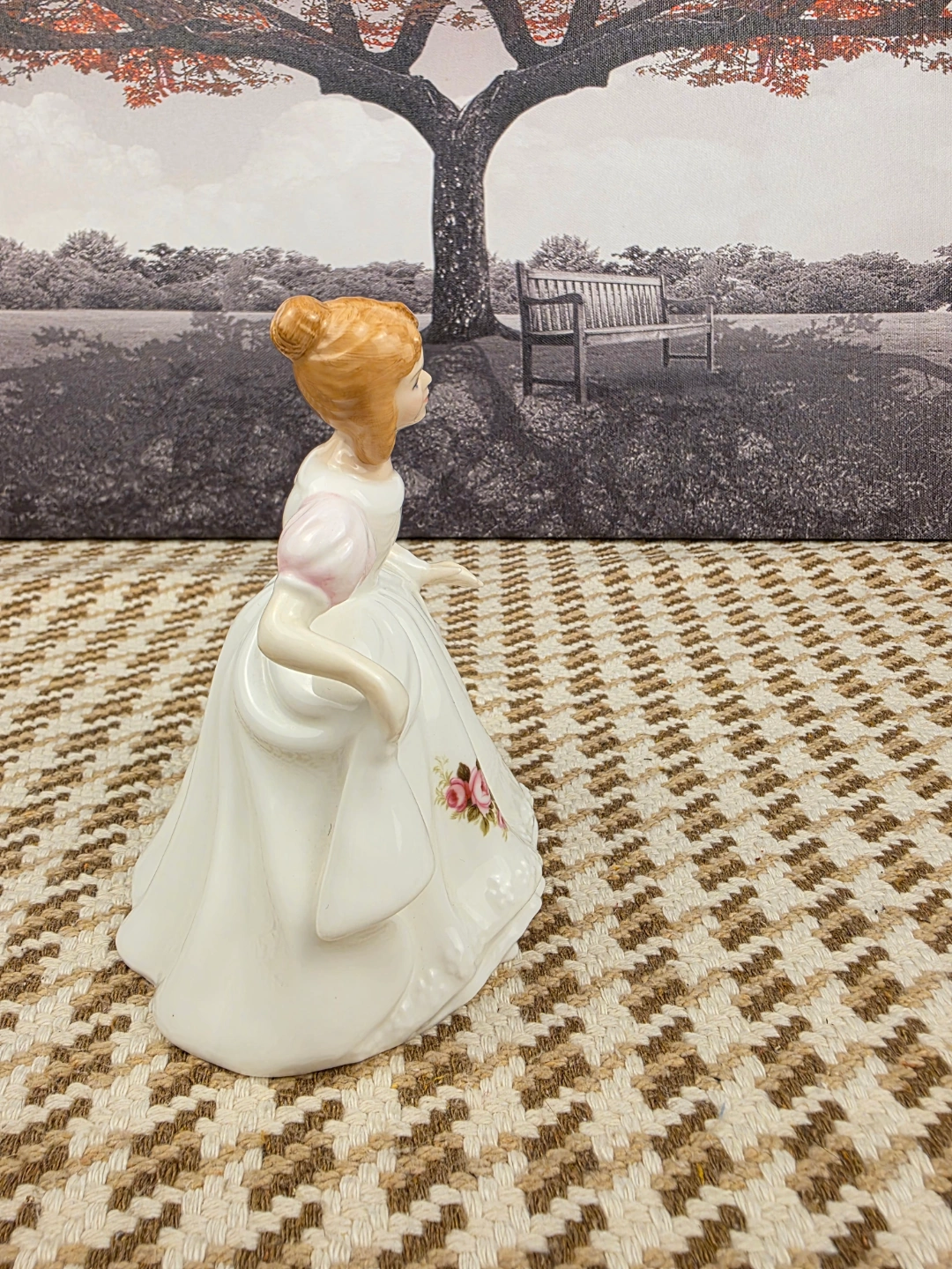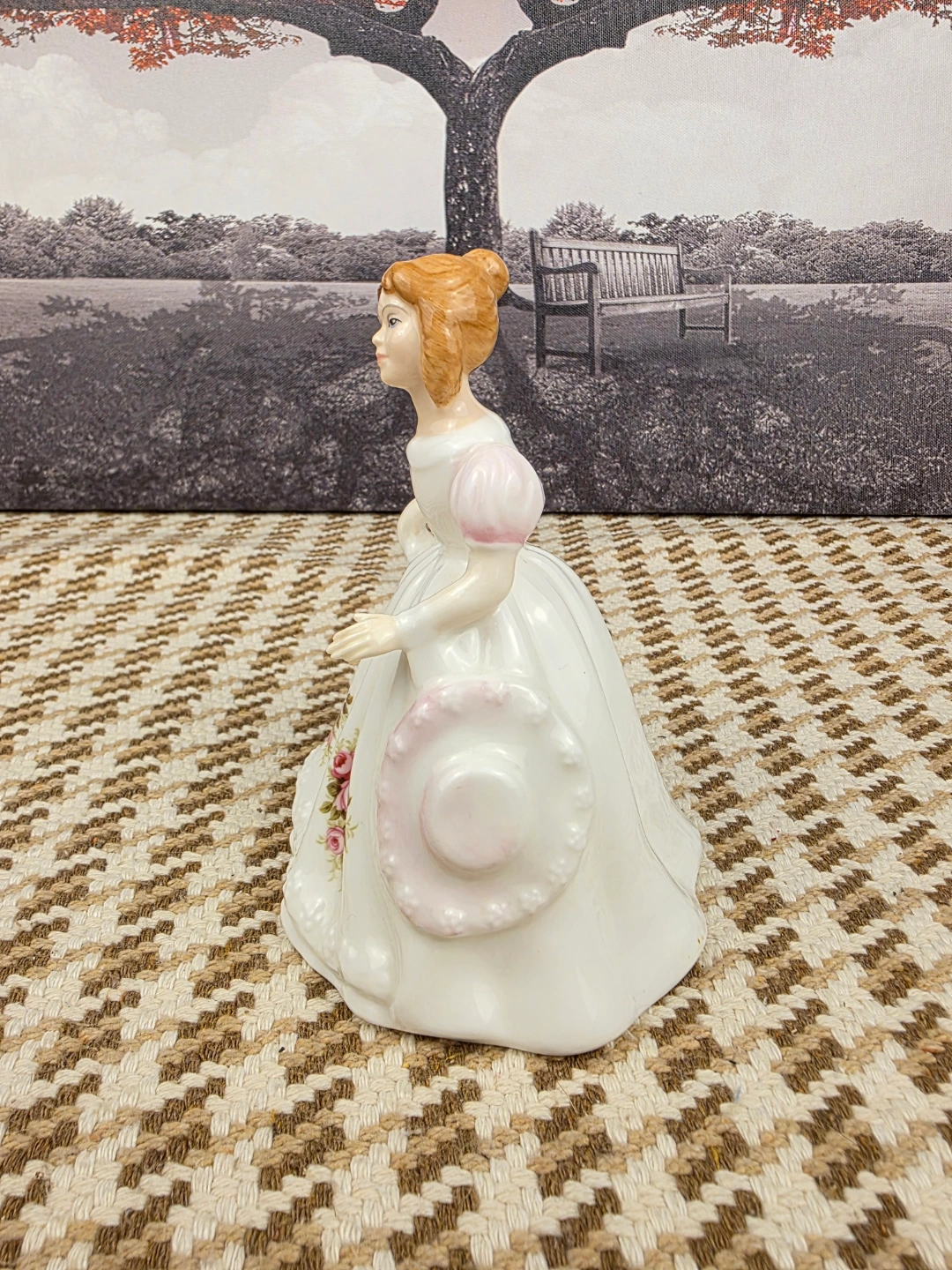 Adorable vintage porcelain figurine. Features a girl in a white gown with pink accents and roses. Detailed sculpting and delicate painting. Collectible item, perfect for display.