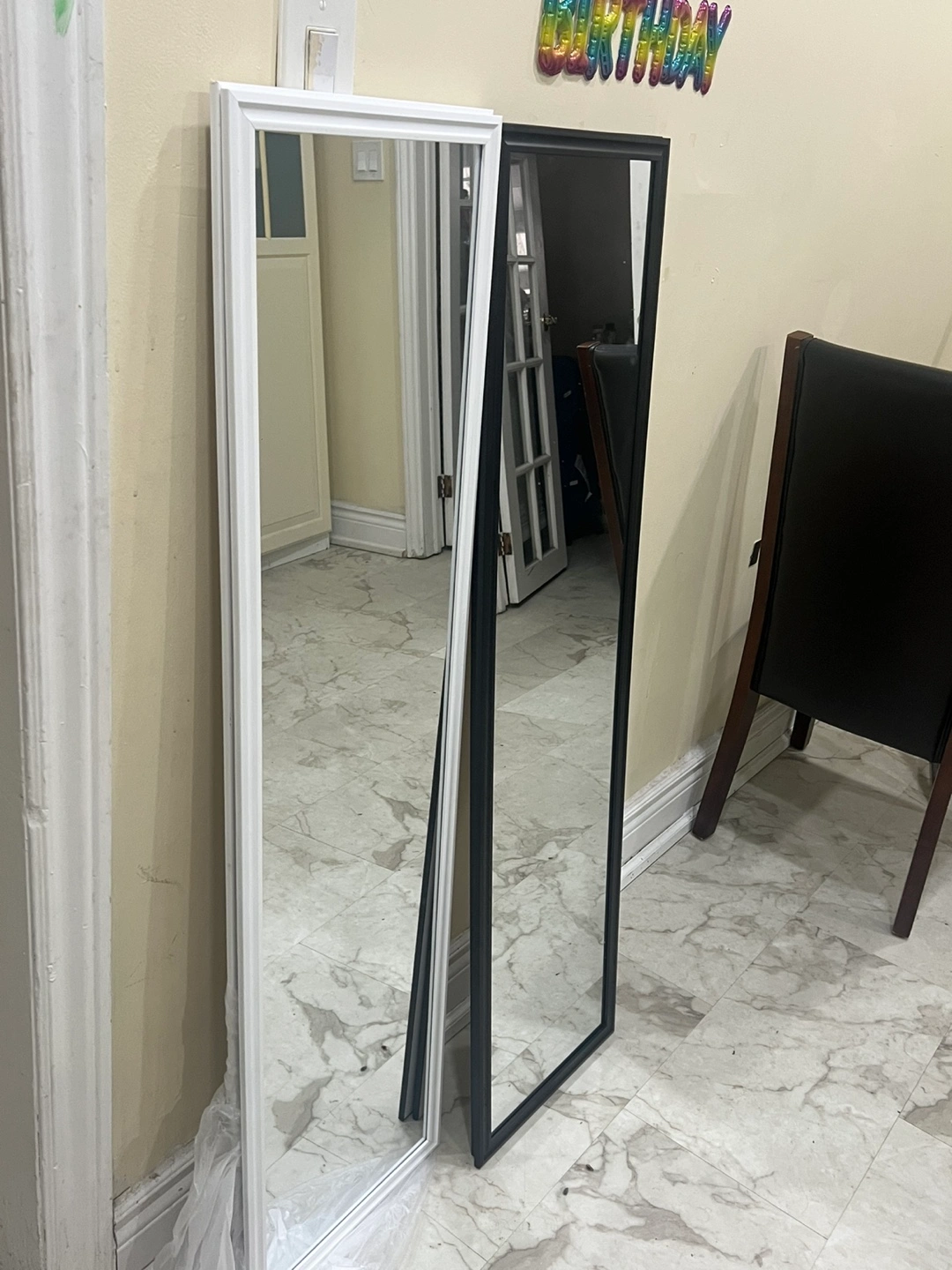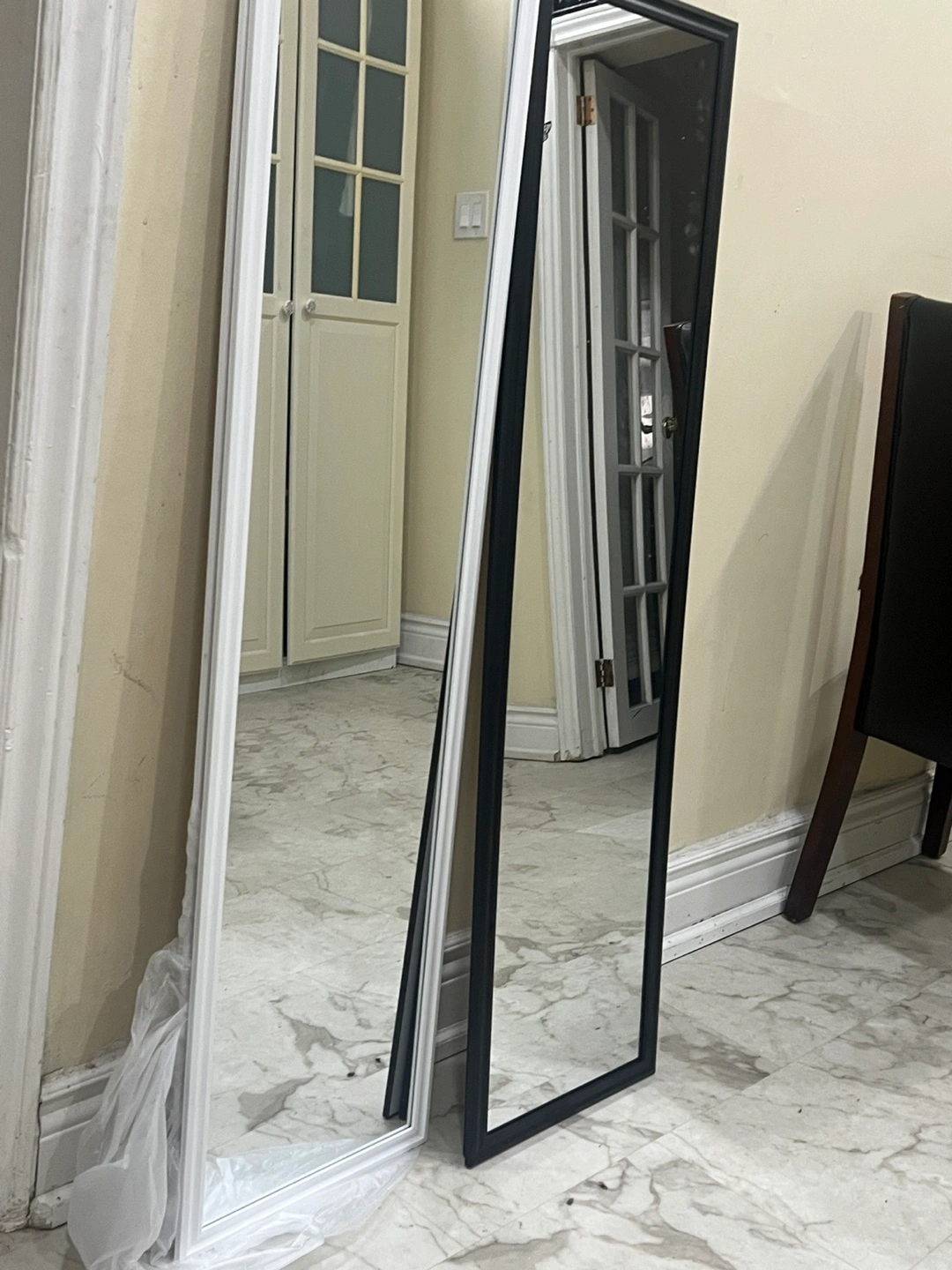 Two full-length mirrors, one with a white frame and one with a black frame. Leaning mirrors, great for a bedroom or hallway. Simple and stylish. 16 each Brand new few in stock