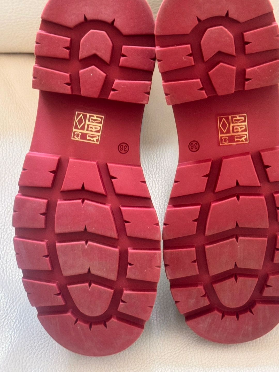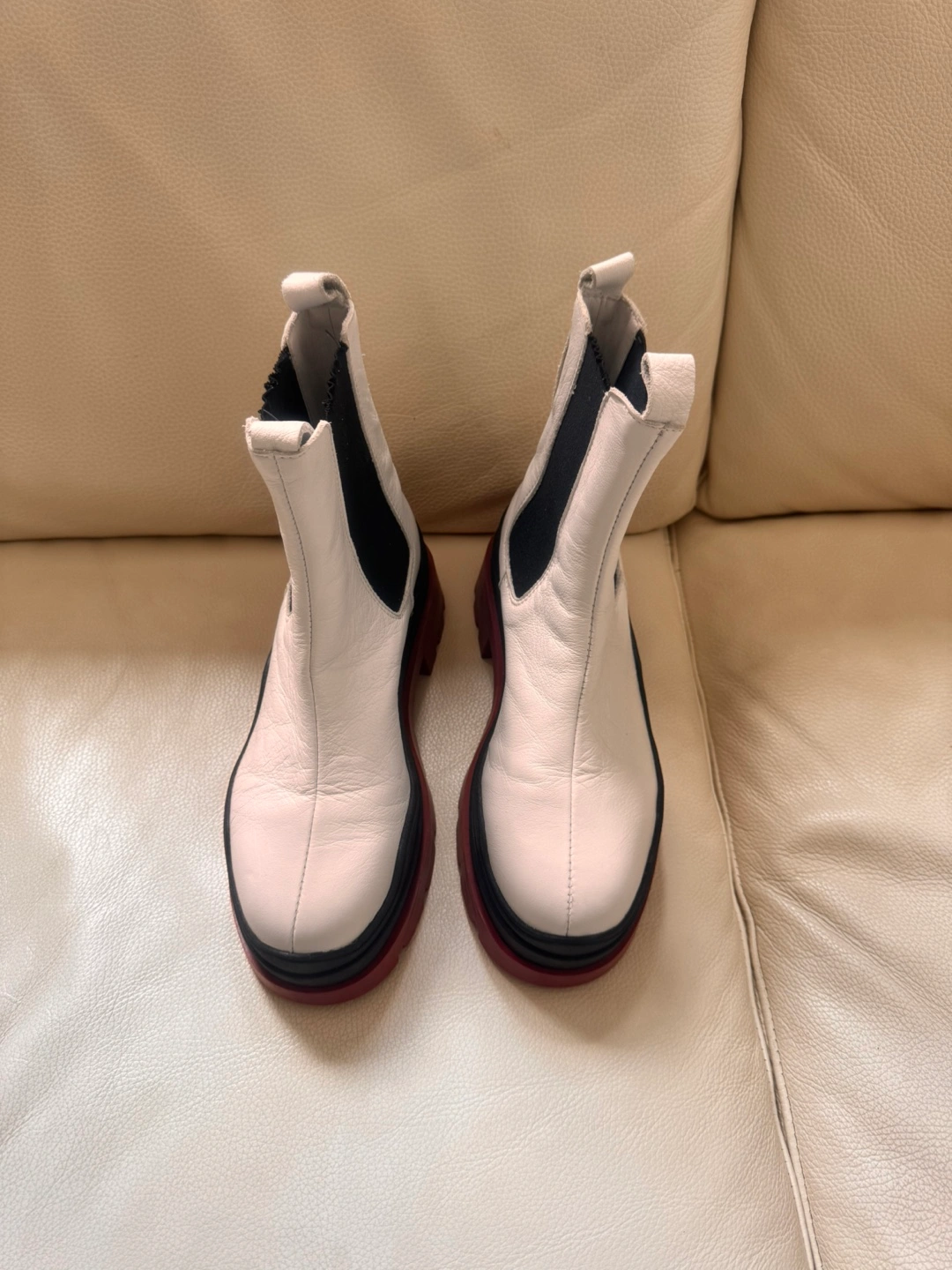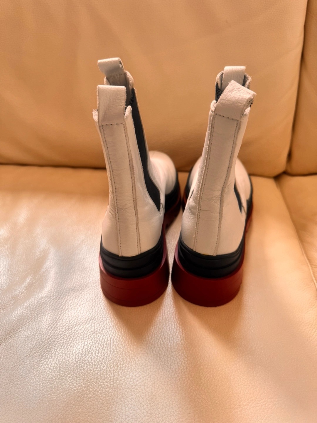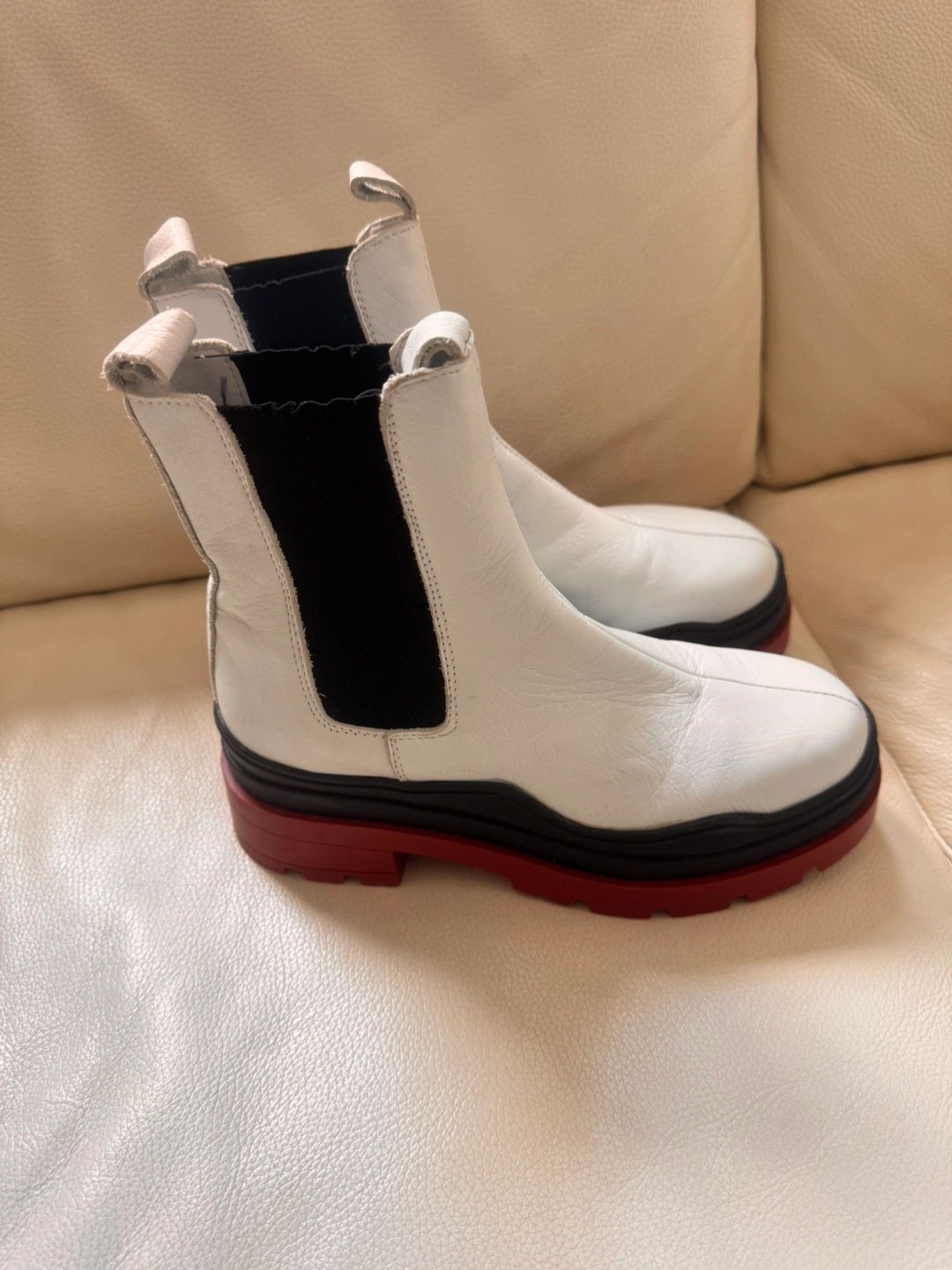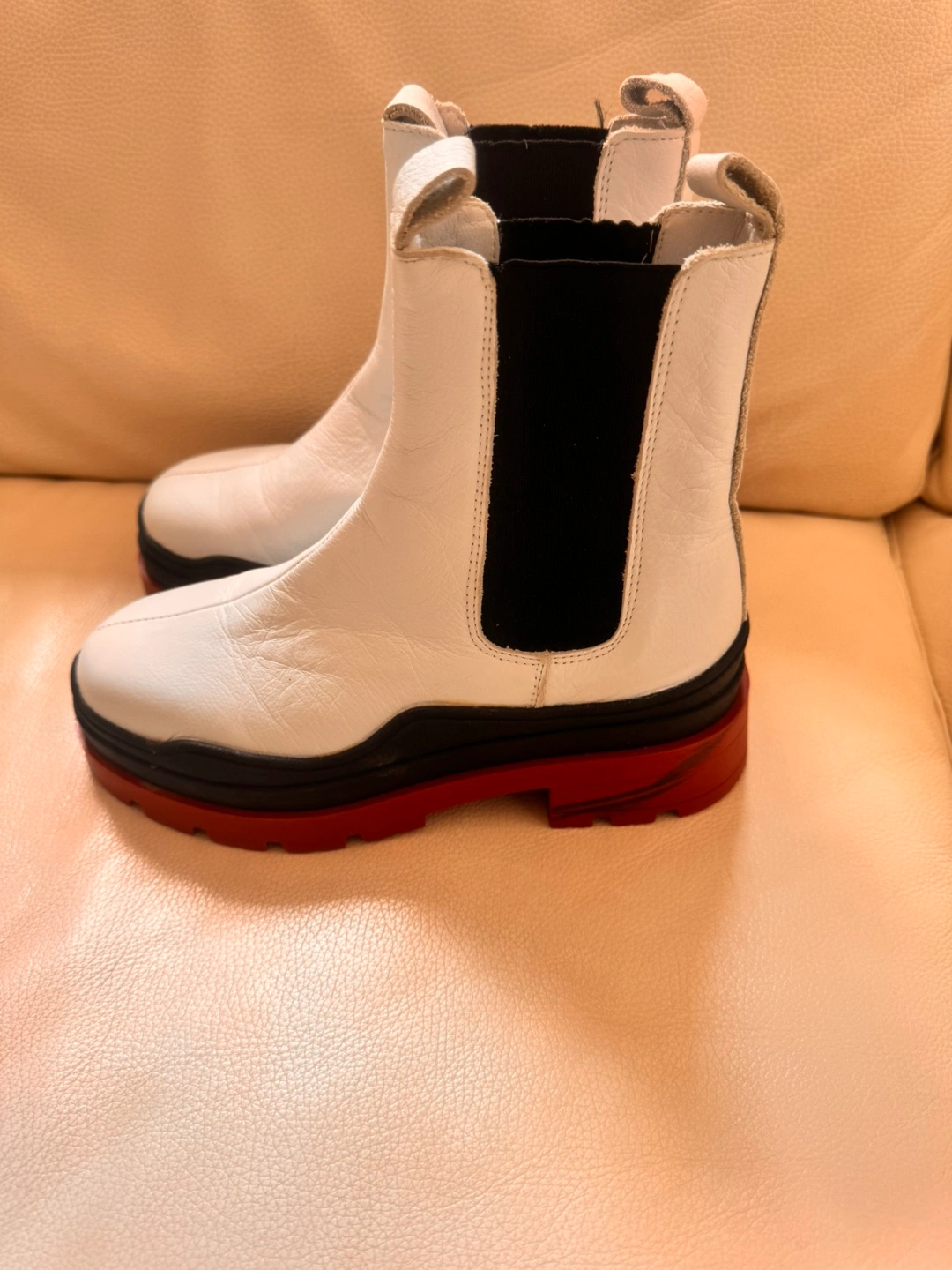 Women's white leather ankle boots. Features a chunky red and black sole. Elastic side panels. Size 36. Reasonable offers too low will be ignored and serious buyers.