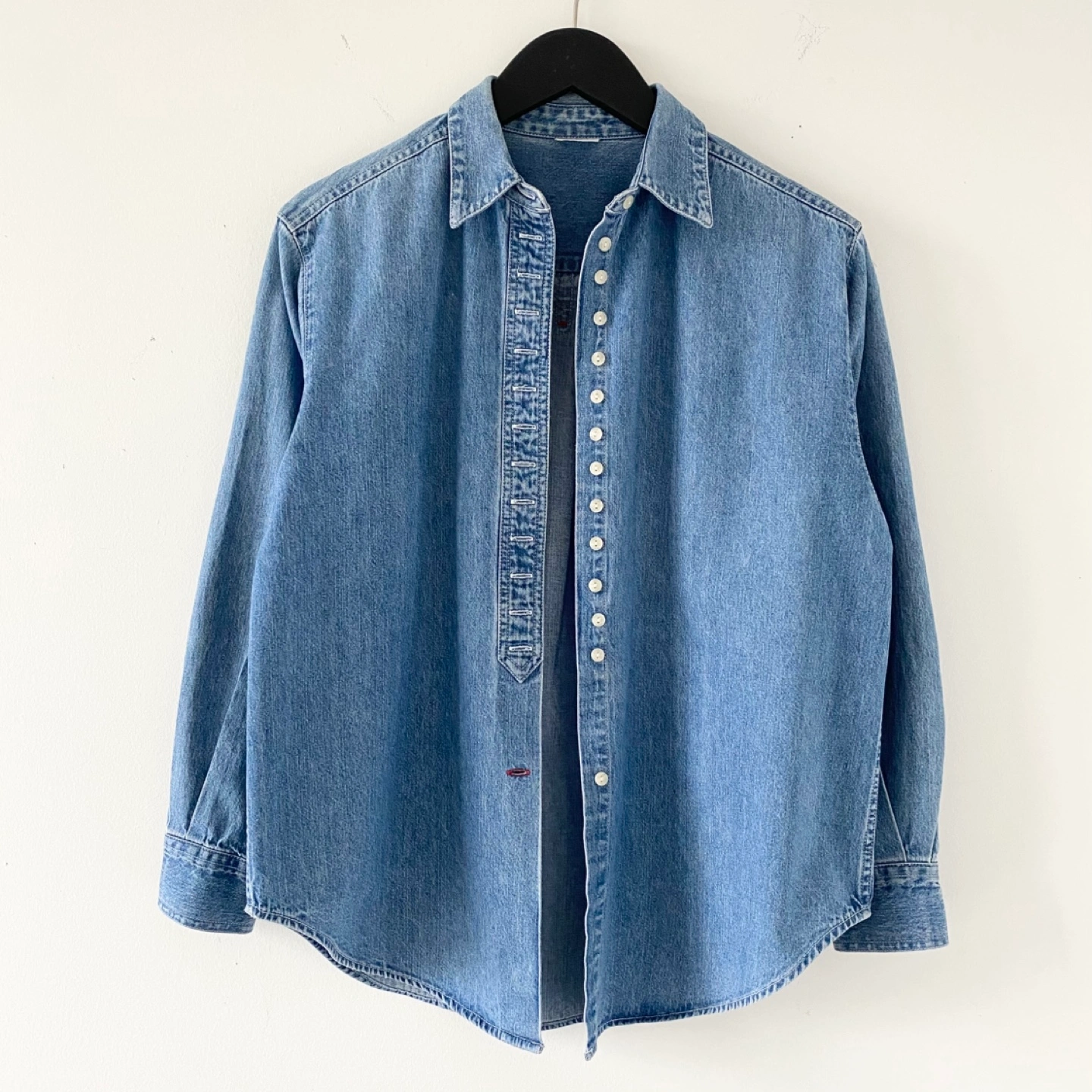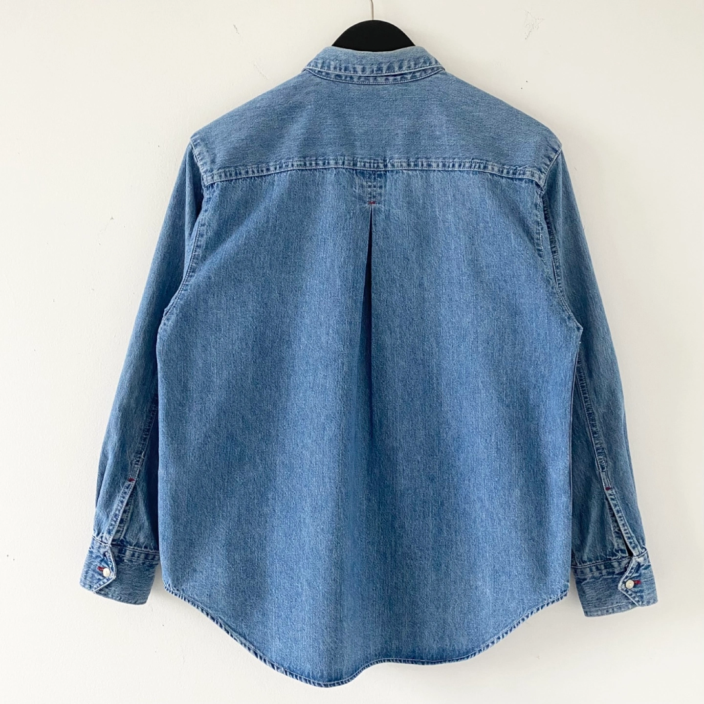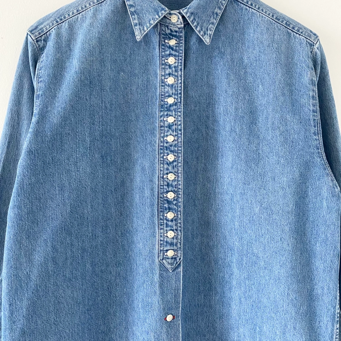 615Pick up only in Leslieville (Queen and Pape) Check out other listings! Vintage shirt with tightly spaced buttons and red accent thread details. All labels have been removed. It fits like an S/M - please see measurements. Must be made of medium weight 100% cotton. There’s some general wear but no staining or damage. It’s clean and in excellent condition. Fits like an S/M Approximate measurements laid flat Shoulder 17.5” Pit to pit 21” Shoulder to cuff 21” Center back length 27”