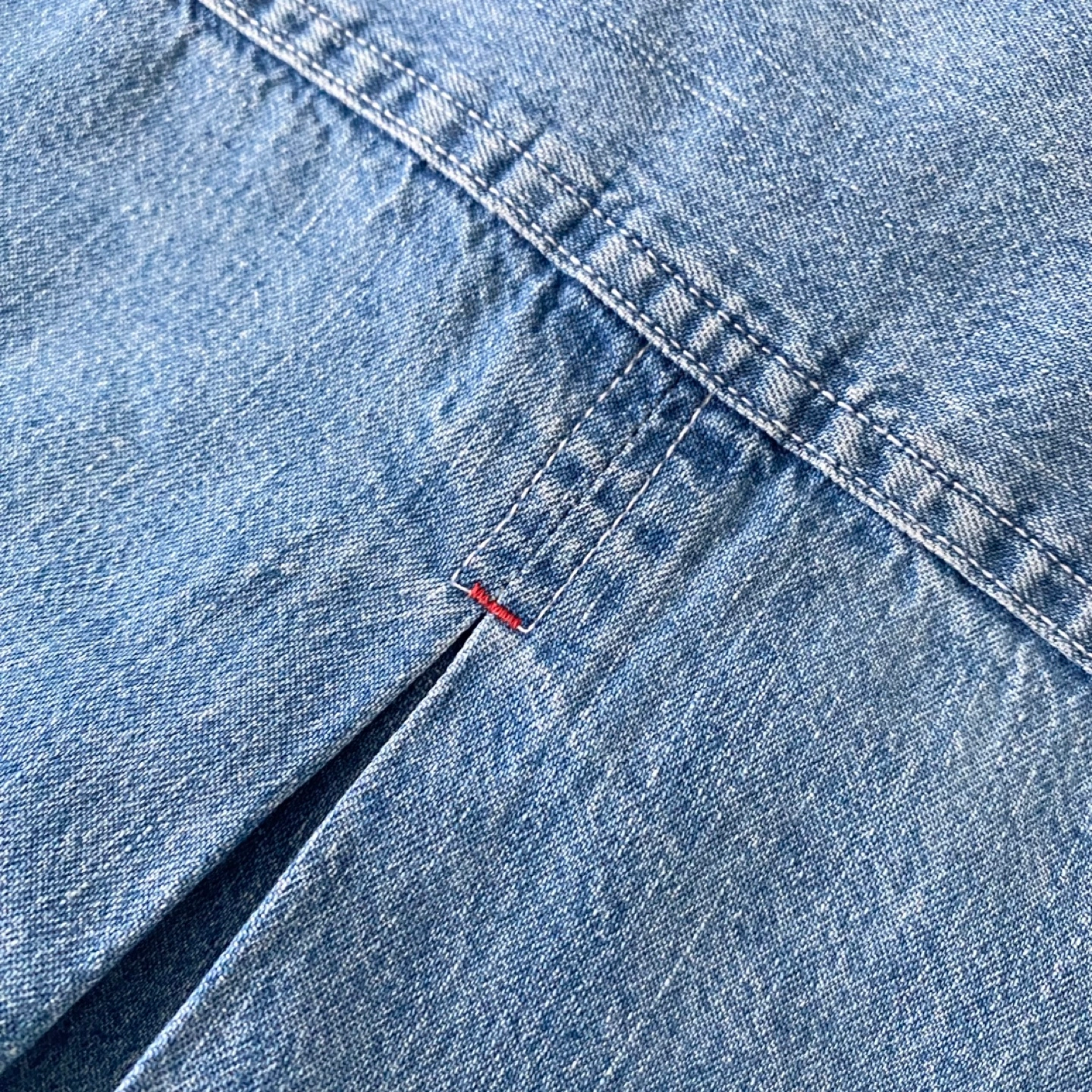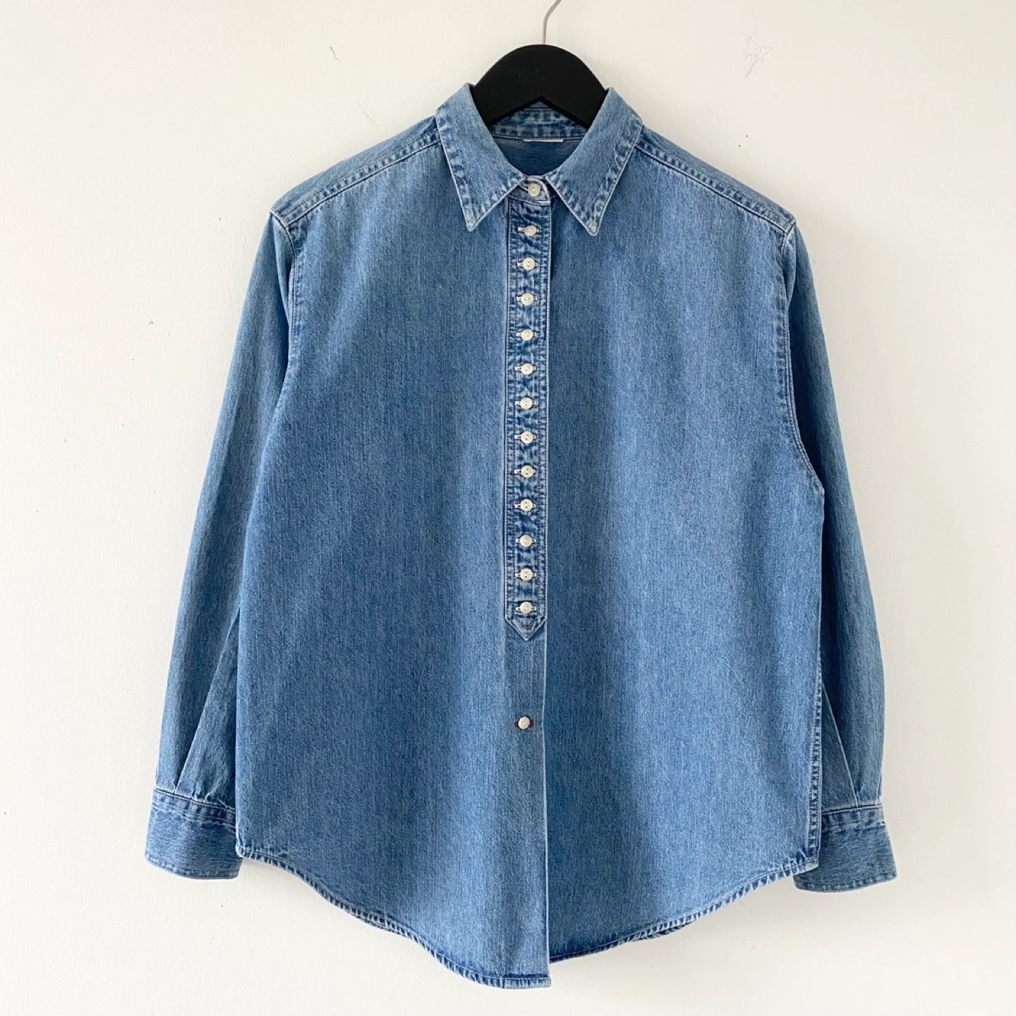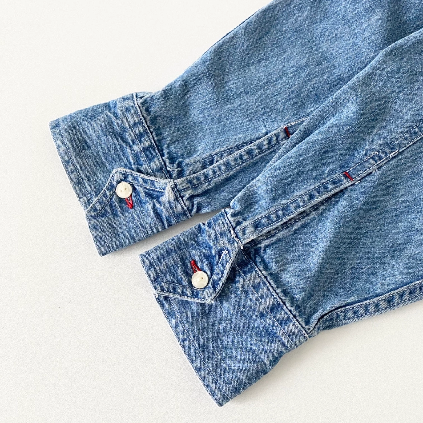 615Pick up only in Leslieville (Queen and Pape) Check out other listings! Vintage shirt with tightly spaced buttons and red accent thread details. All labels have been removed. It fits like an S/M - please see measurements. Must be made of medium weight 100% cotton. There’s some general wear but no staining or damage. It’s clean and in excellent condition. Fits like an S/M Approximate measurements laid flat Shoulder 17.5” Pit to pit 21” Shoulder to cuff 21” Center back length 27”