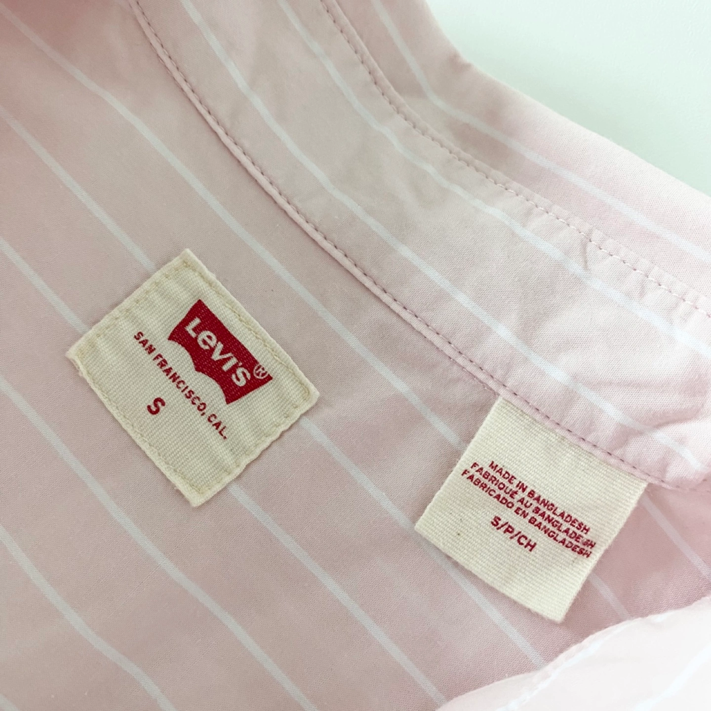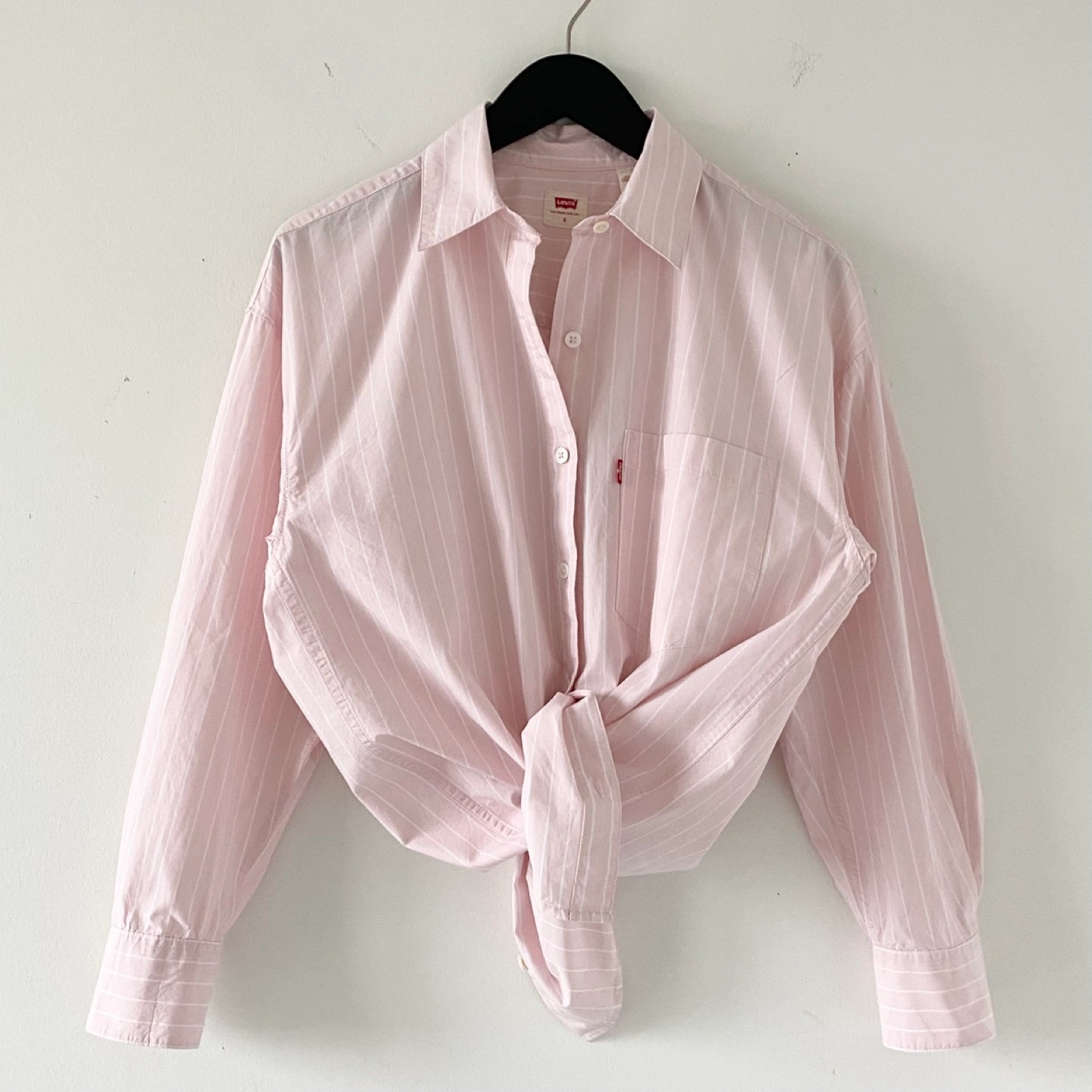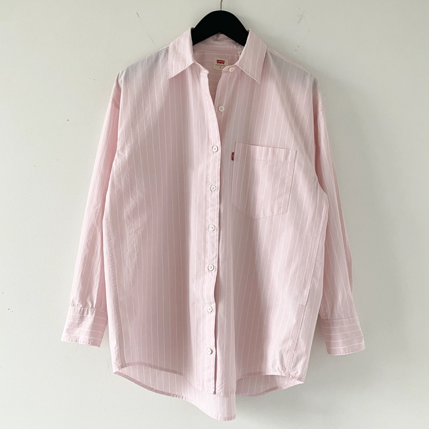 615Pick up only in Leslieville (Queen and Pape) Check out other listings! Levi's menswear inspired button-up shirt. Features an oversized fit, roomy sleeves and a patch pocket. Made of lightweight 100% cotton in light pink and white stripes. It's soft, crisp and drapes nicely. There's no staining or damage, It's clean and in excellent condition. Size S (oversized) Approximate measurements laid flat Shoulder 21.5” Pit to pit 24” Shoulder to cuff 20.5” Center back length 30.75”