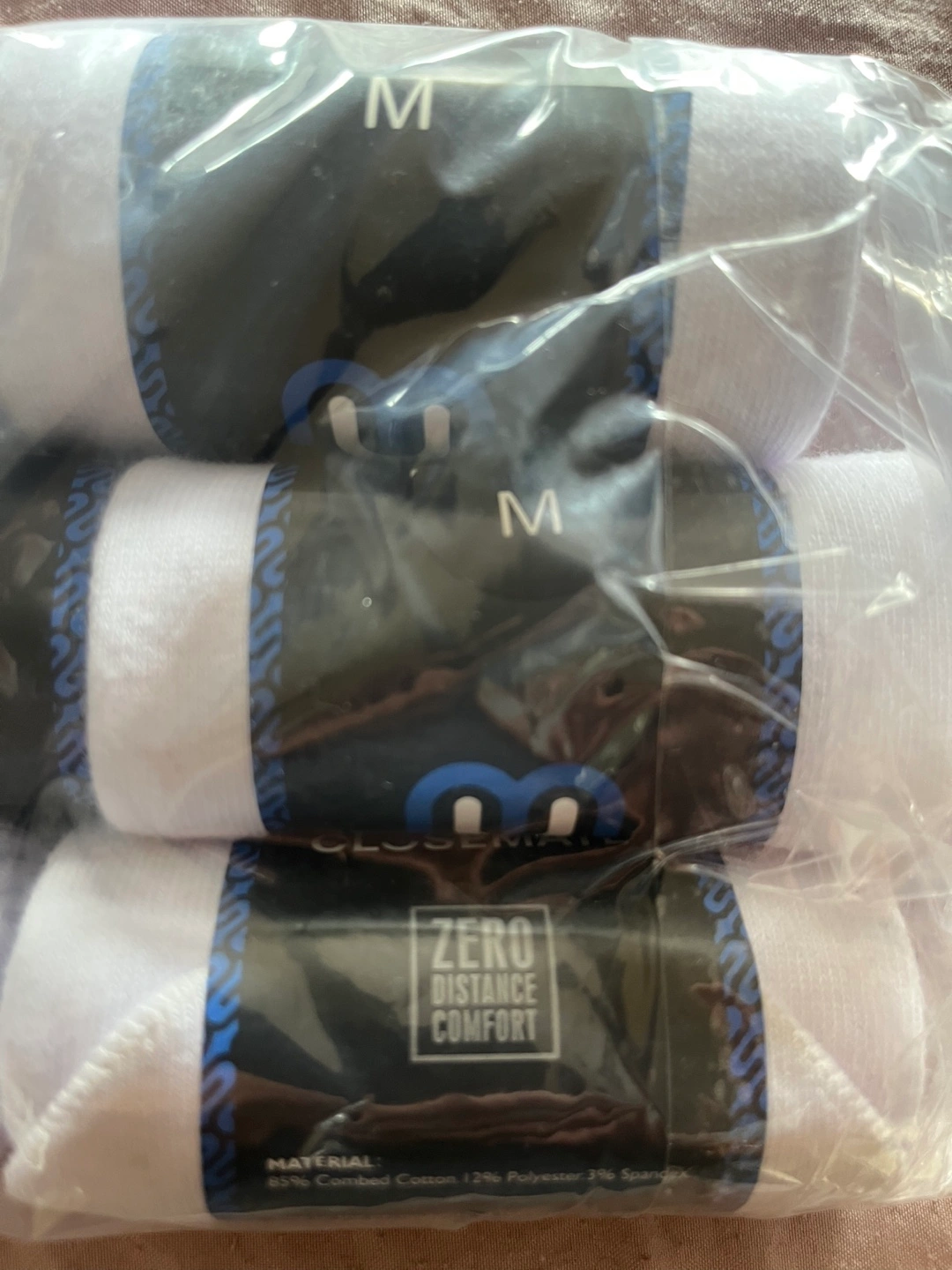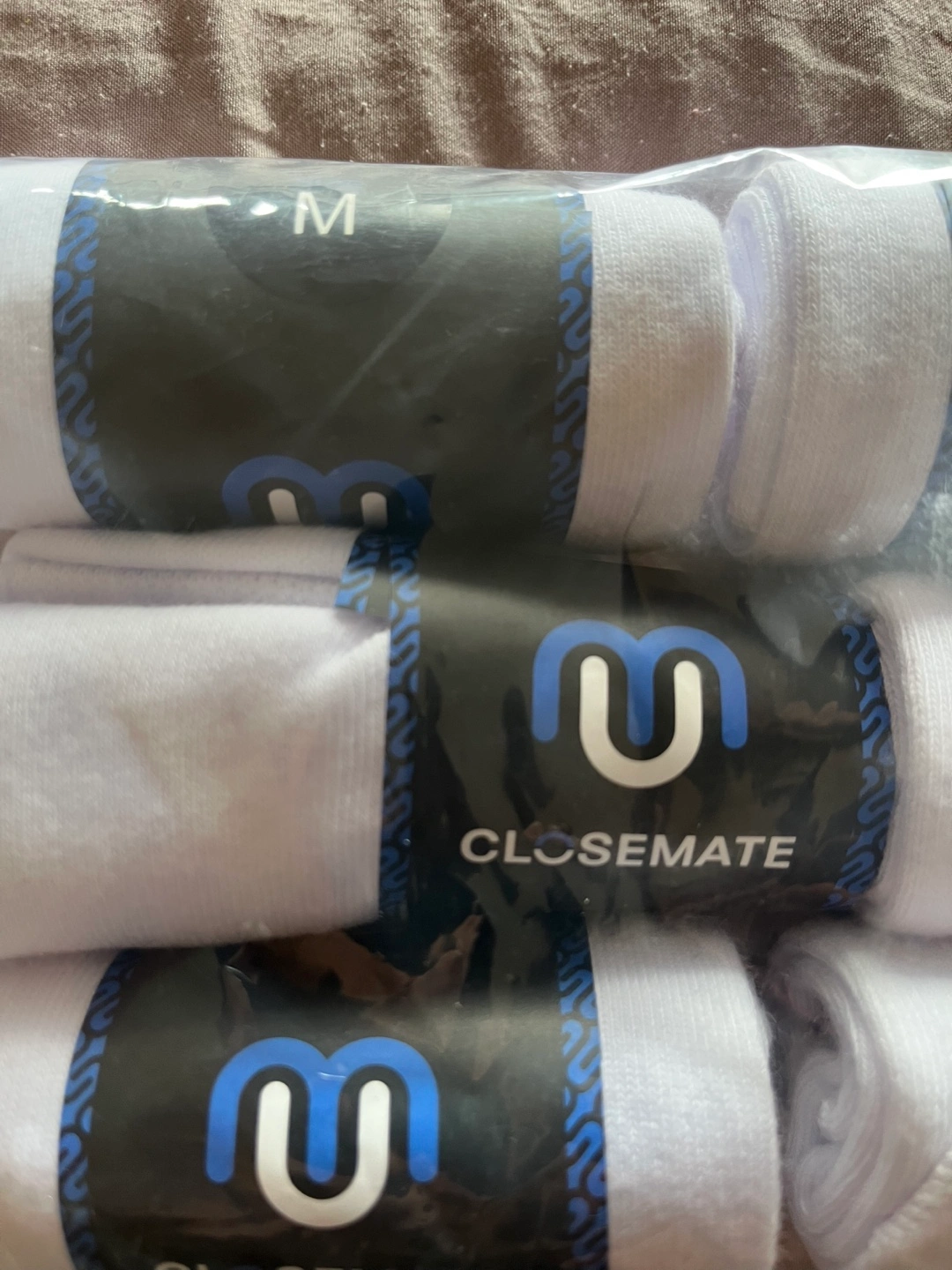 New, unopened package of six pairs of men's white crew socks. Size Medium. 85% combed cotton, 12% polyester, 3% spandex. Zero distance comfort.