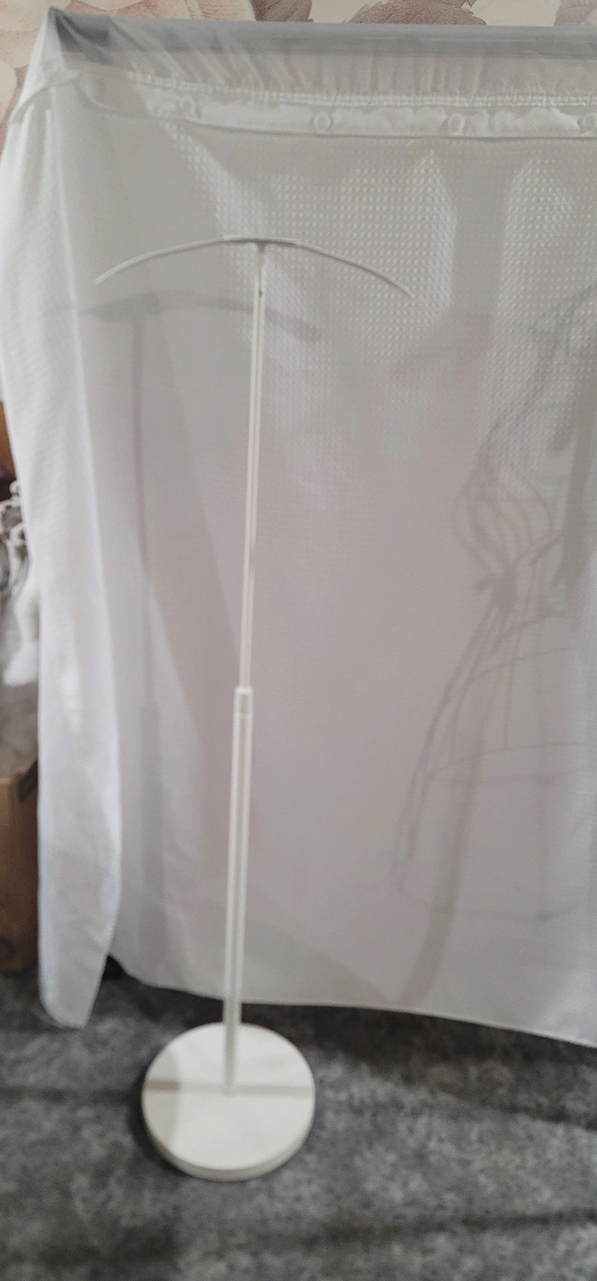 Simple, freestanding garment rack. White metal construction. Round base. Perfect for displaying clothes.