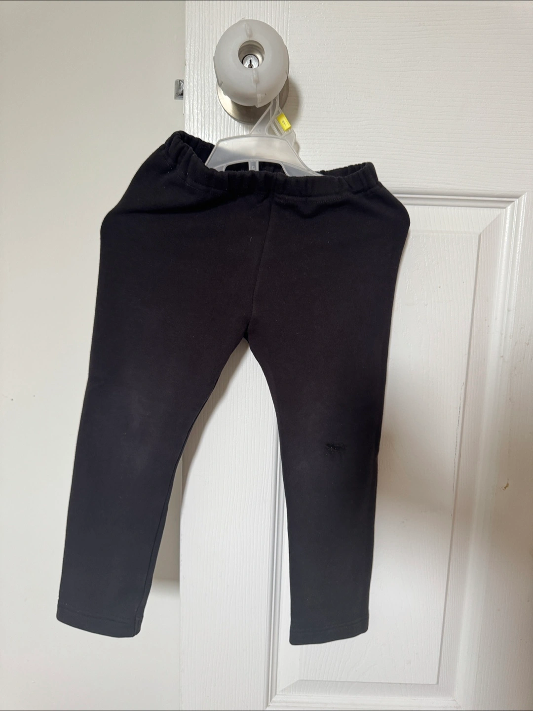 Black baby leggings. Size 3. Small hole on one leg. Elastic waistband. Back pocket. Little worn out on left knee as shown in last photo