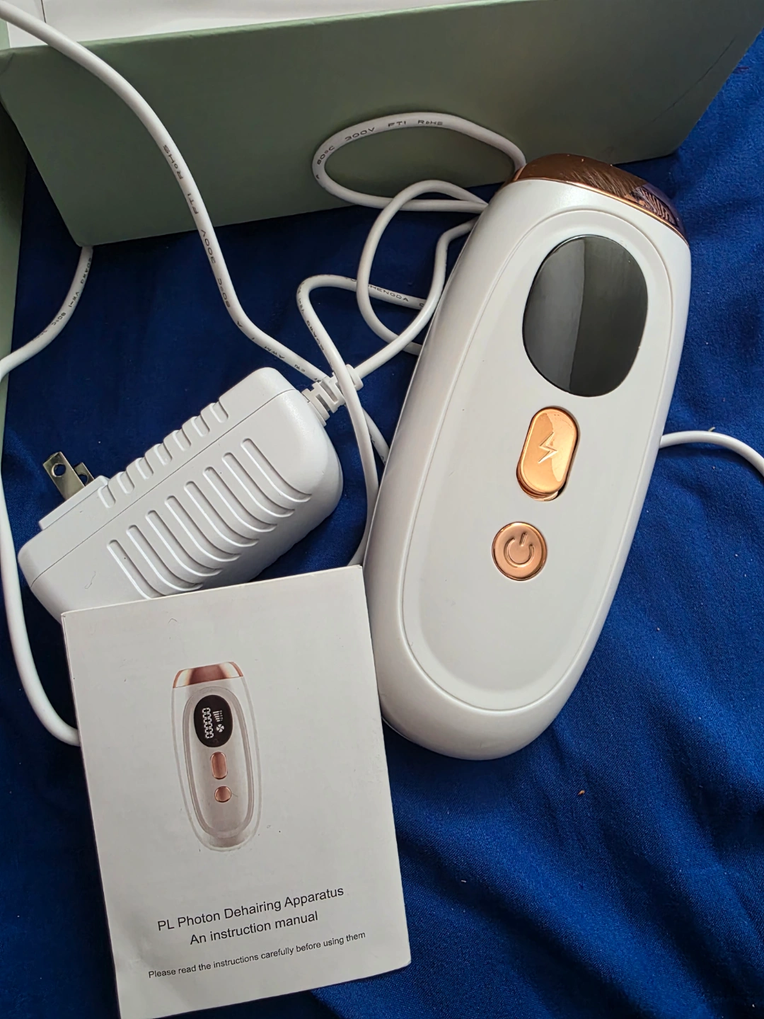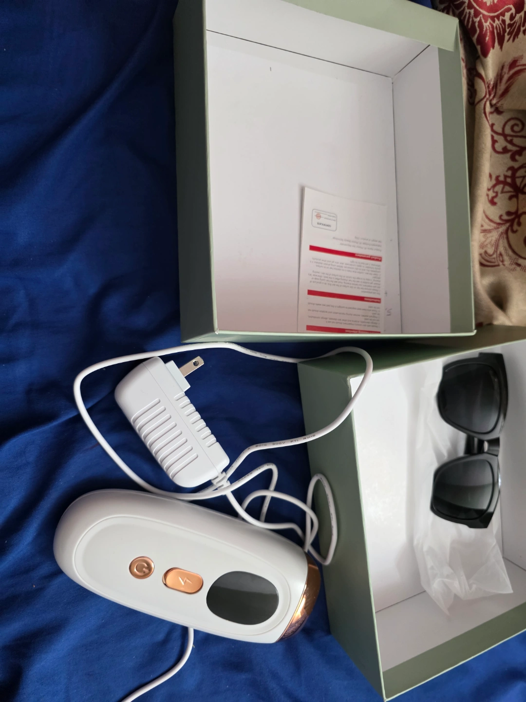 Handheld IPL hair removal device. Includes power adapter, protective eyewear, and instruction manual.
