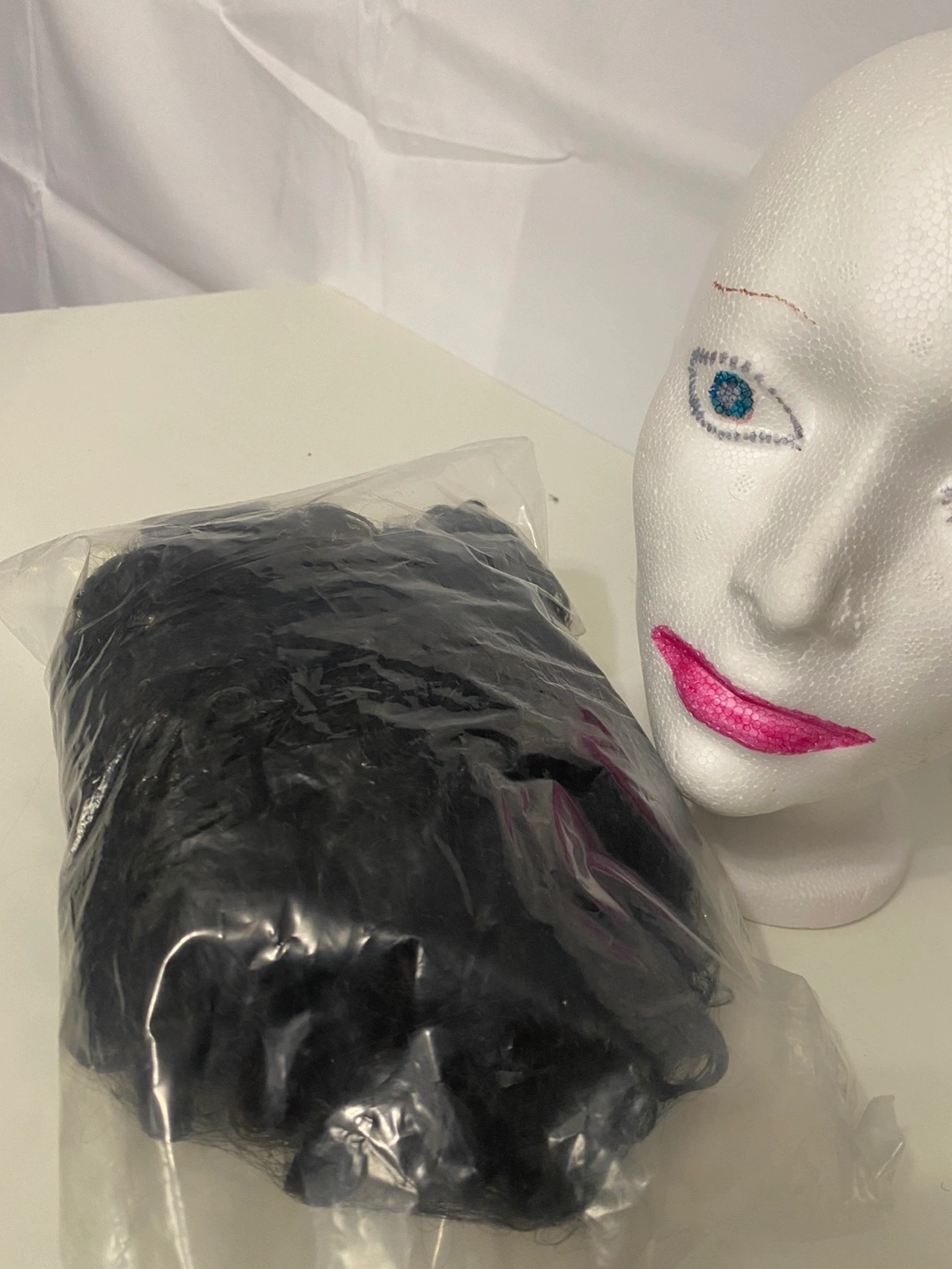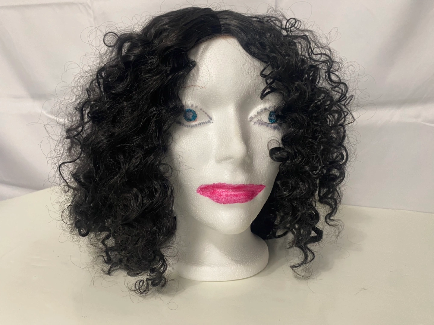 Short black curly wig.