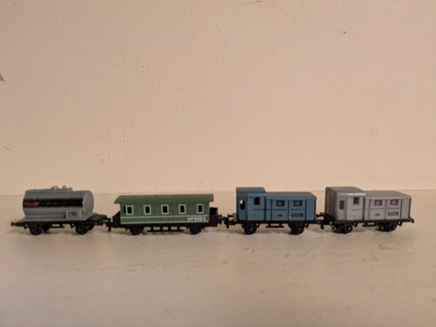 Four-piece miniature toy train cars by Soma 1989 Includes a tanker car, passenger car, and two boxcars. Great for collectors or children.