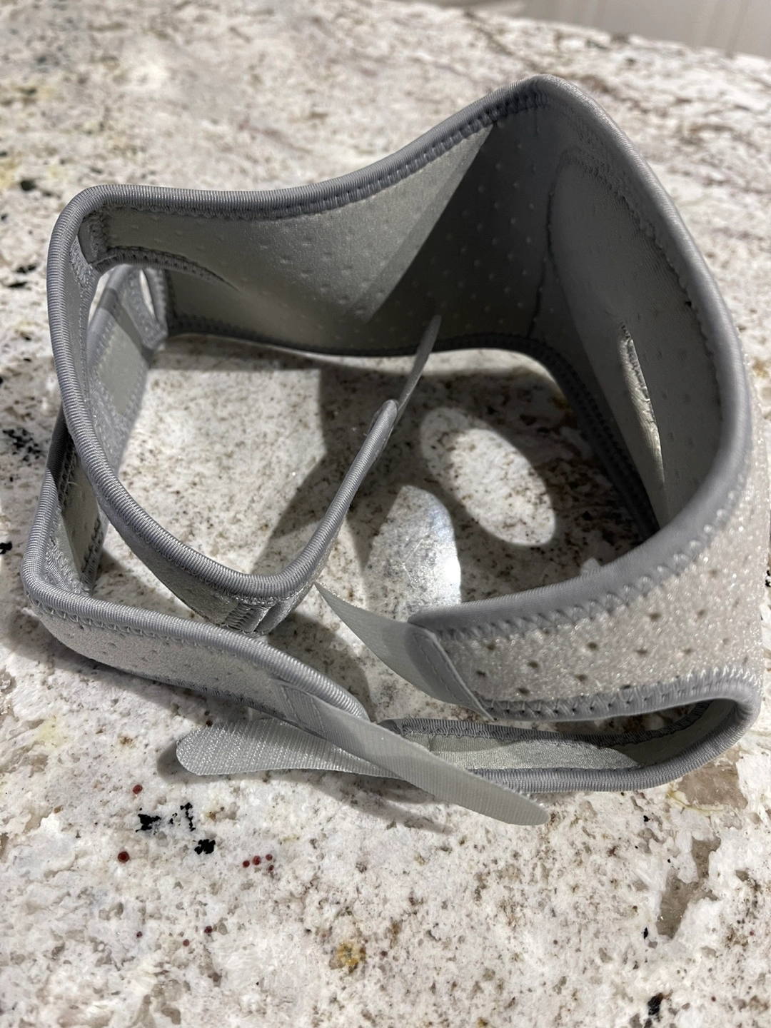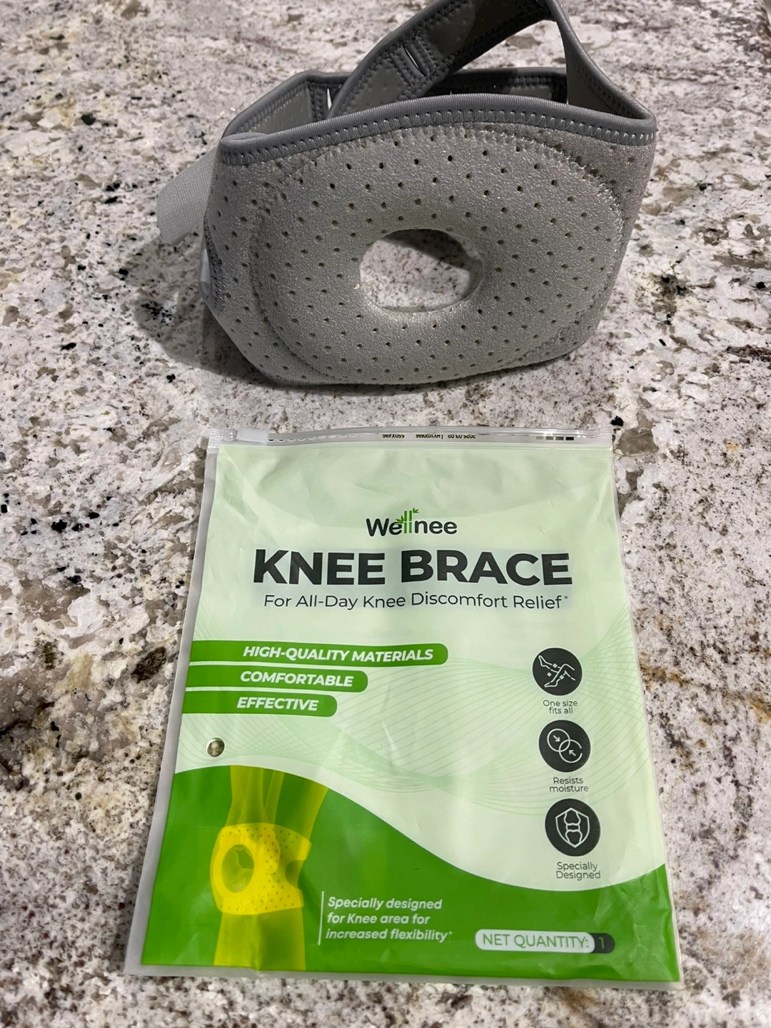 Grey knee brace. Provides all-day discomfort relief. High-quality materials. Comfortable and effective. One size fits all. Resists odour. Specially designed for increased flexibility.