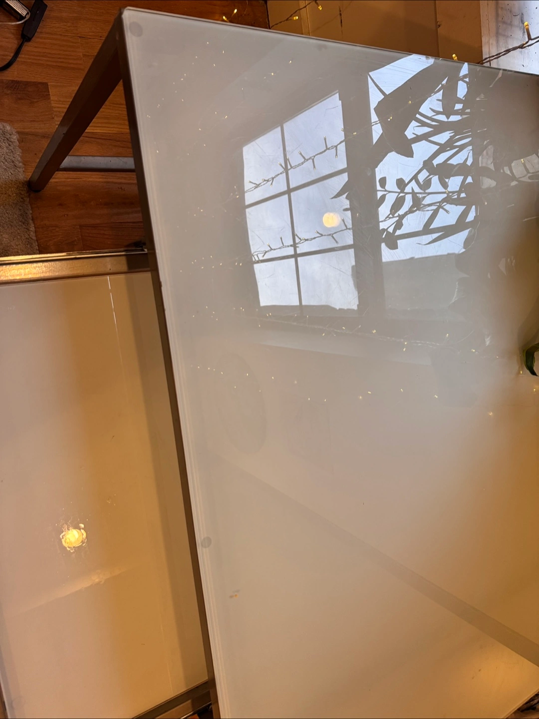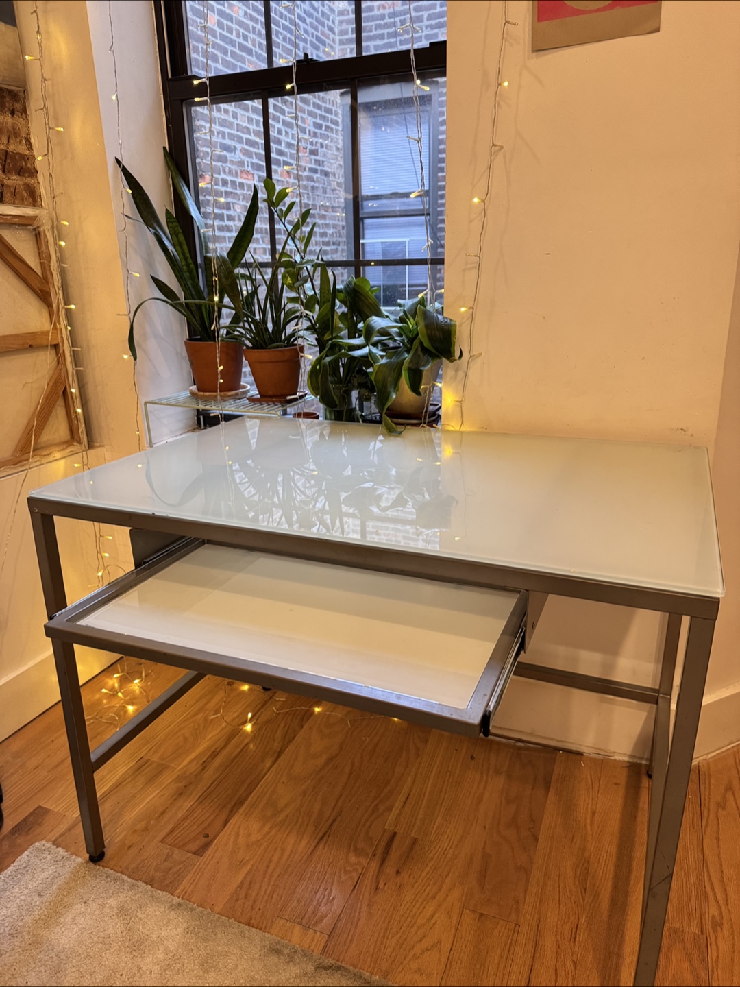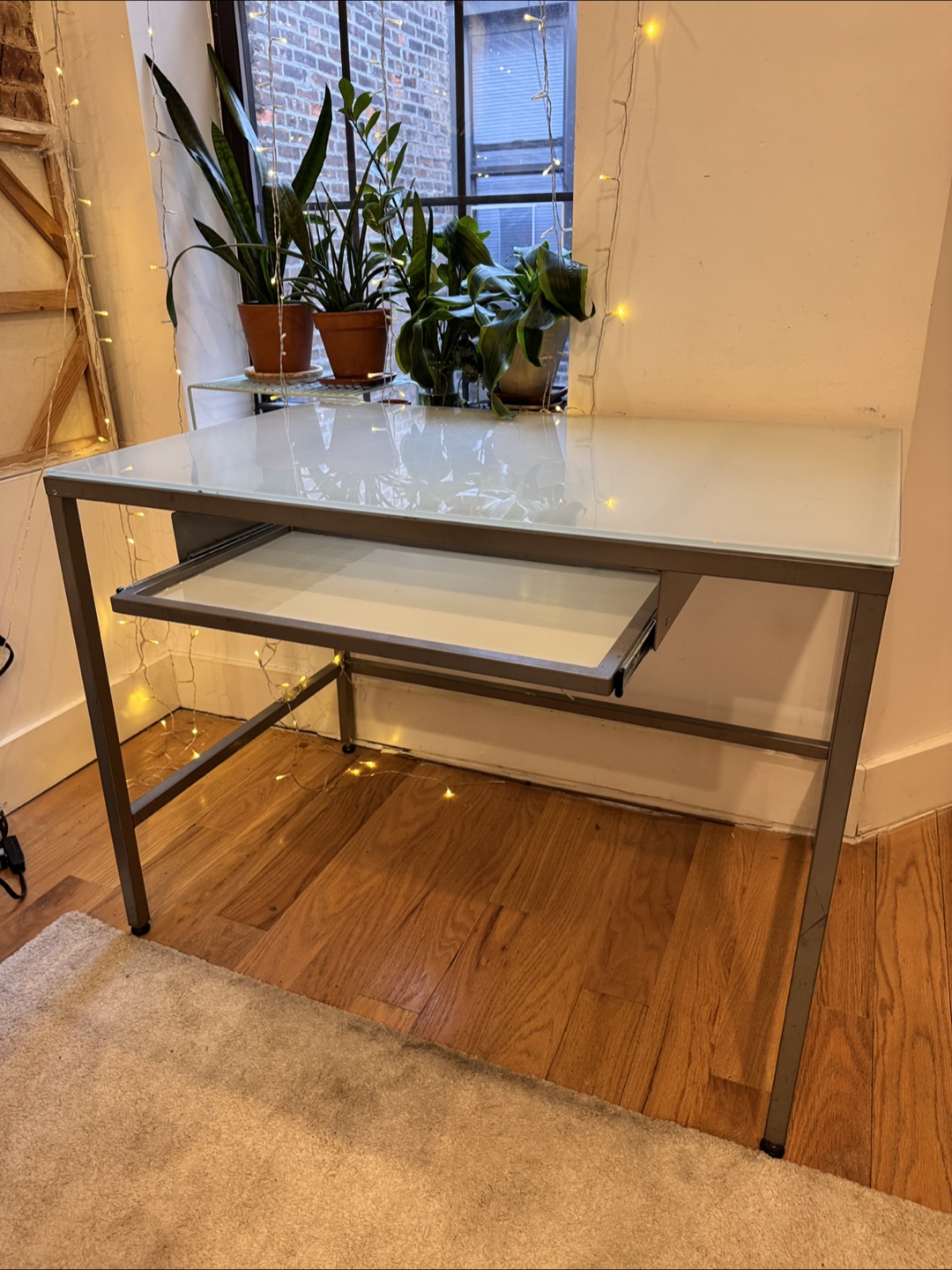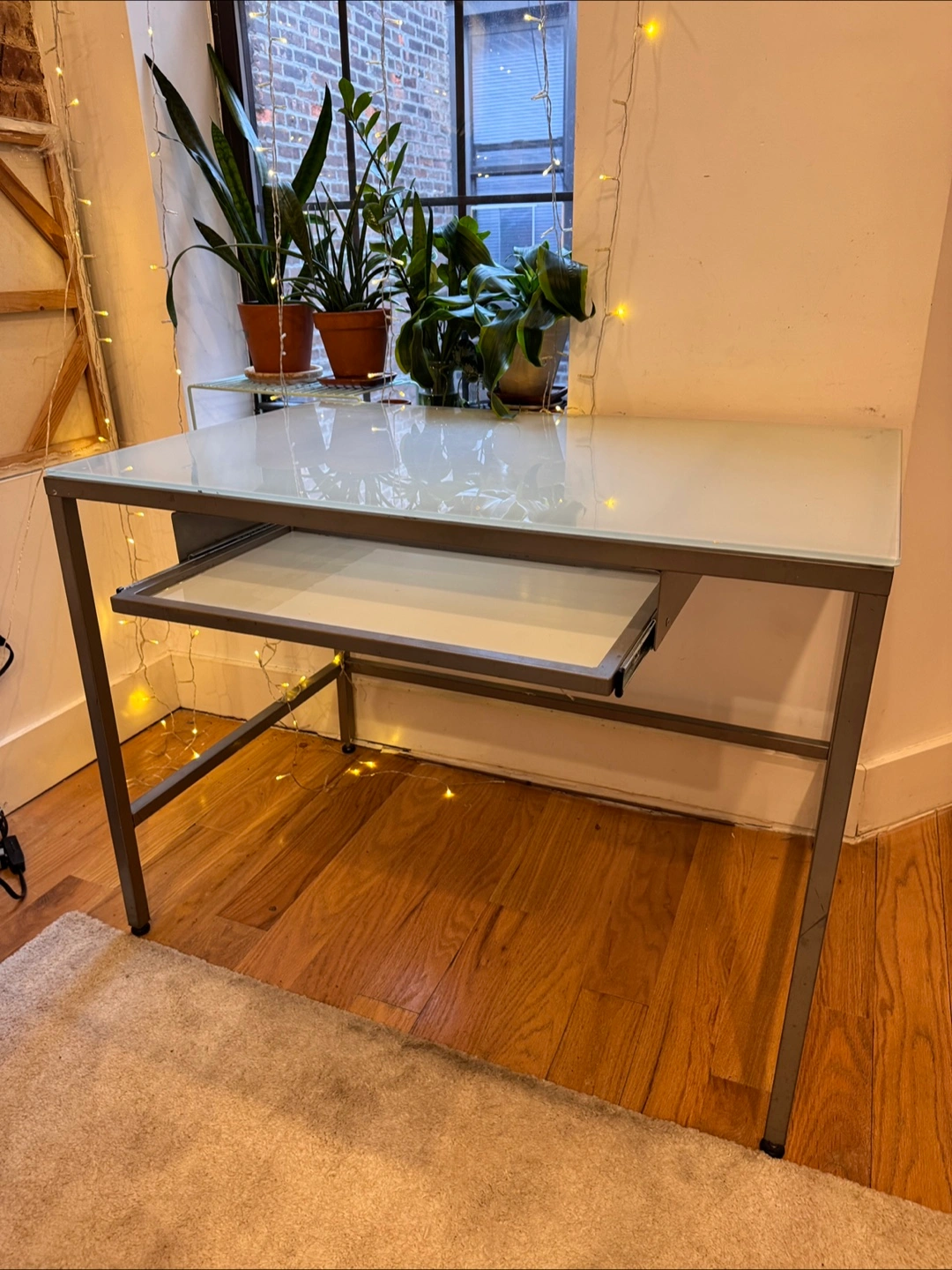 Modern computer desk. Features a glass top and a slide-out keyboard tray. Metal frame.