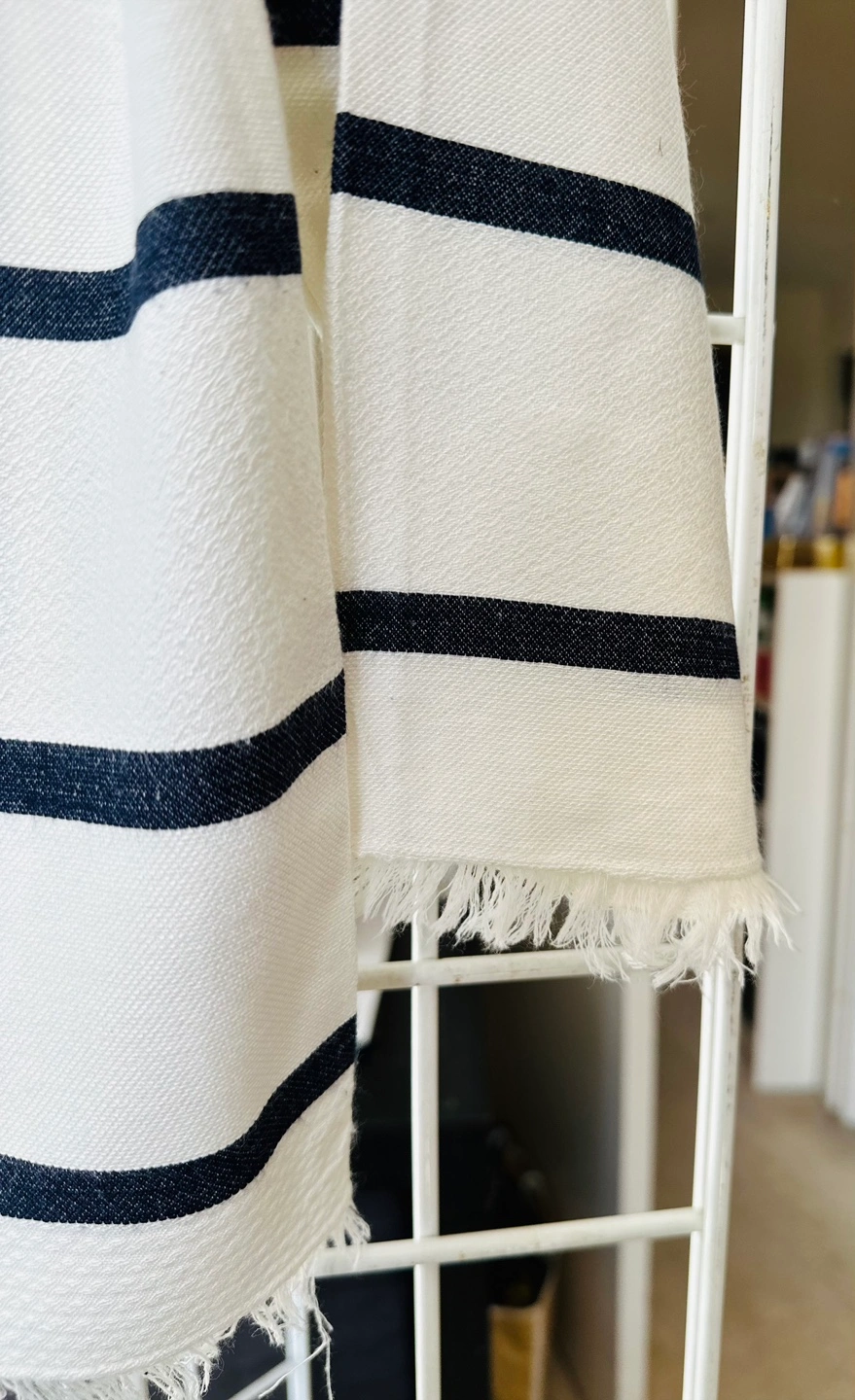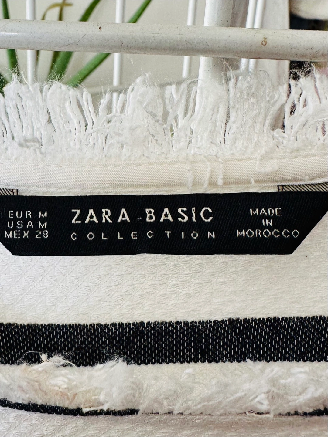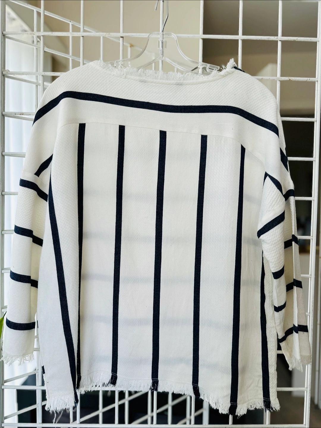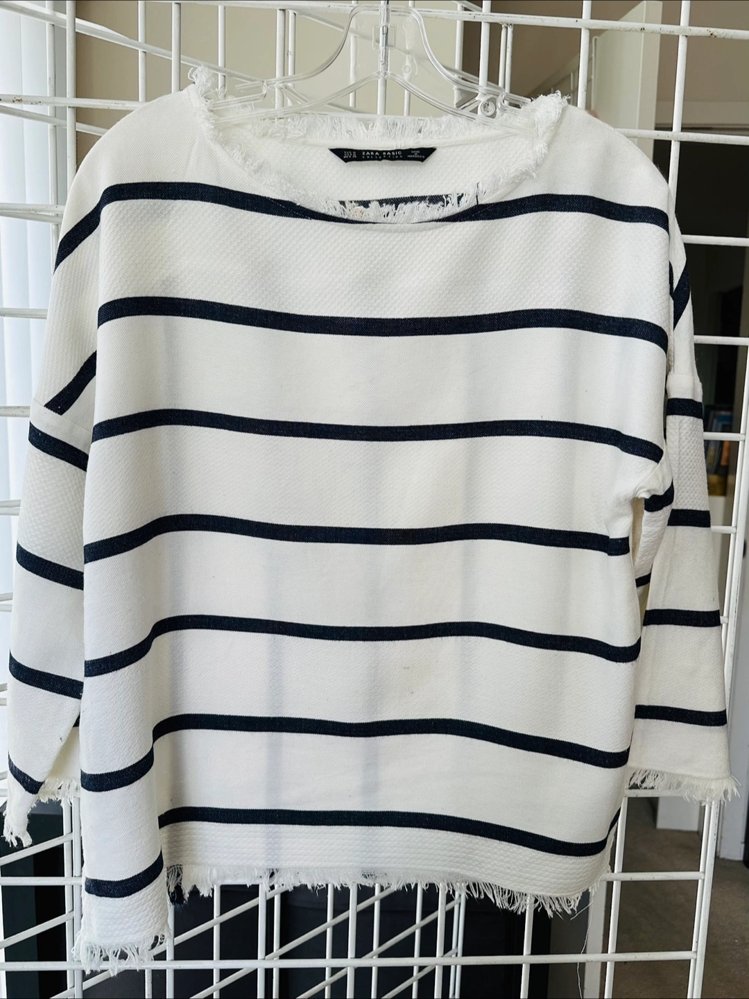 Women's cropped sweater. White with navy blue stripes. Three-quarter sleeves. Raw edge hem. Size EUR M, US M, MEX 28. Made in Morocco.