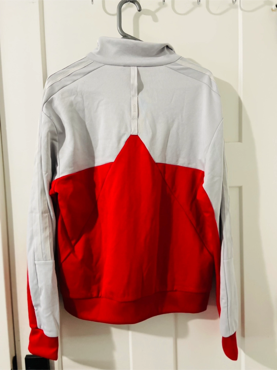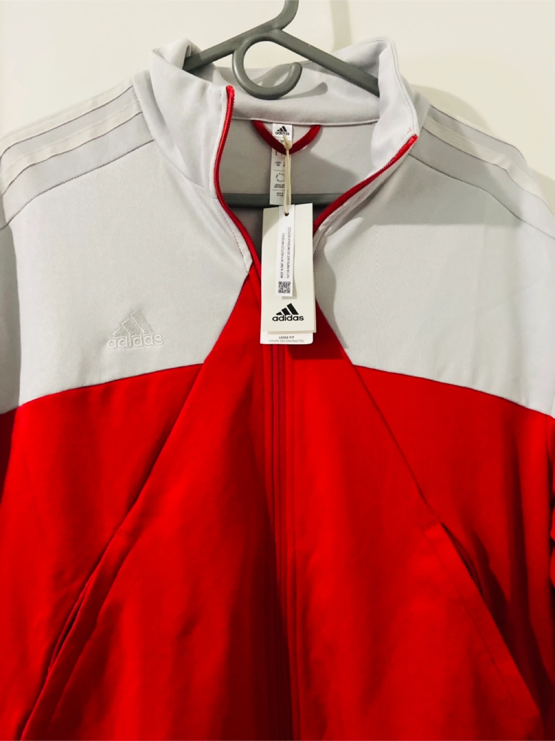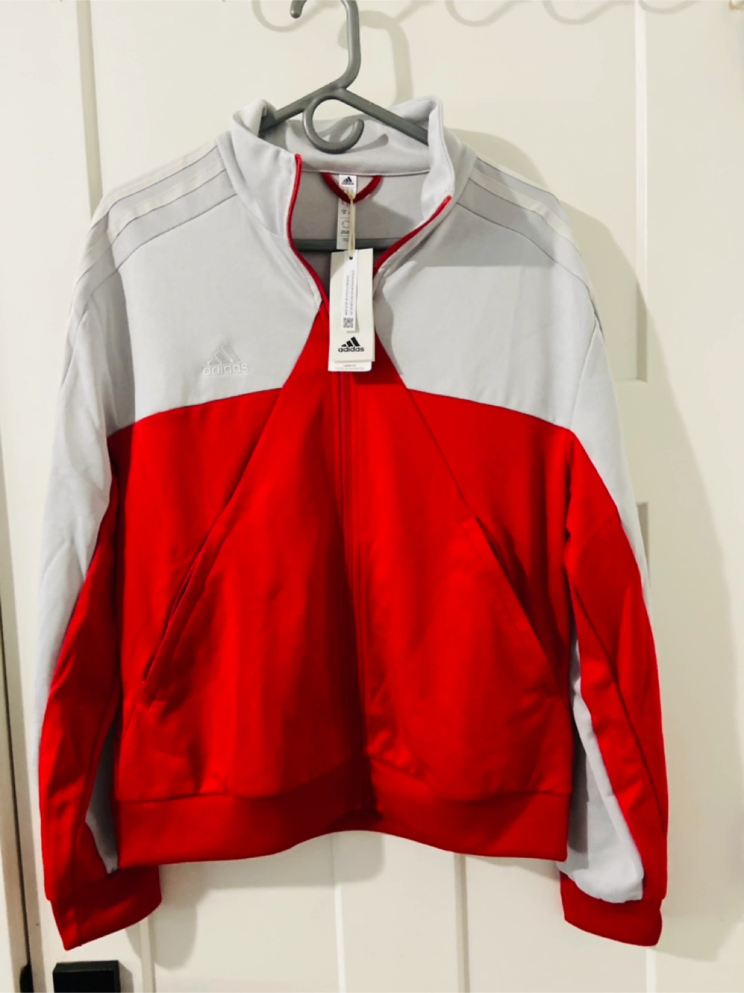 Adidas track jacket. Red and grey colour block design. Full zip closure. Long sleeves. New with tags.