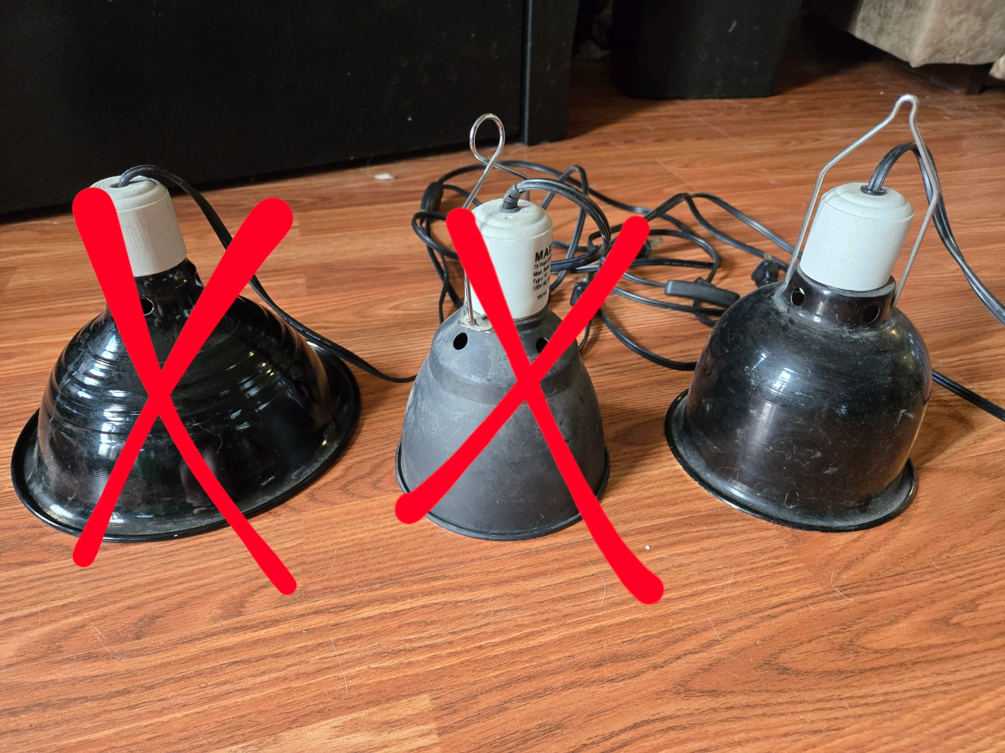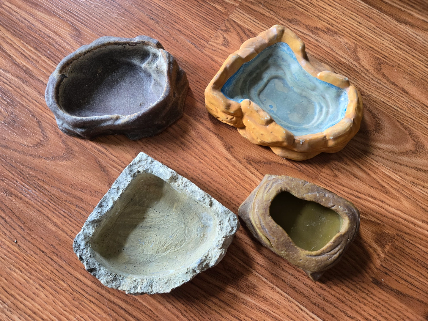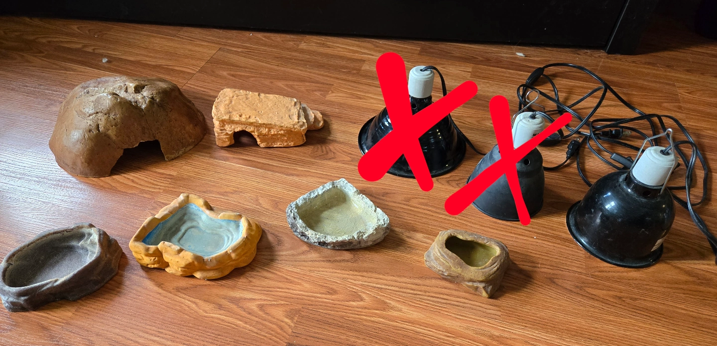 The food/water bowls are in great condition, and you can even use them as a sandbox to train your guys to relieve themselves in one spot. The heat lamp shade, although it looks rough works perfectly. They can even be used for small furry critters. Our guys no longer need these so come get them. π