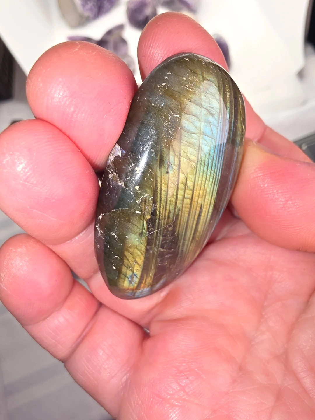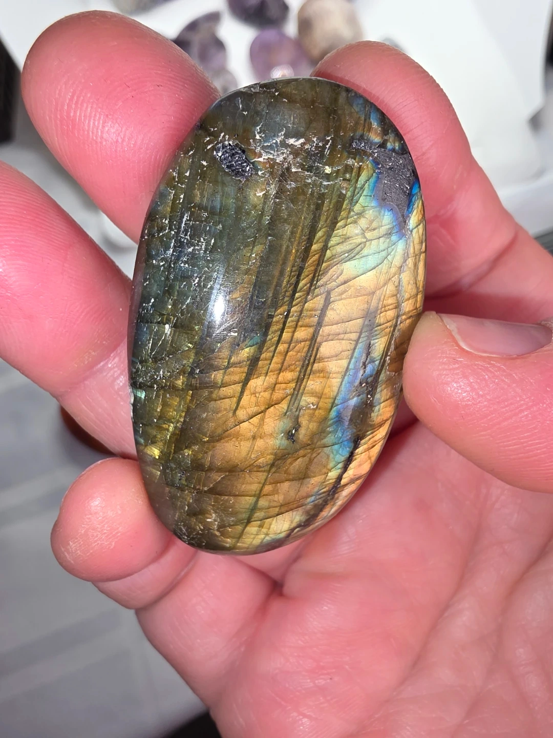 This is a polished labradorite palm stone. It displays beautiful labradorescence with blue and yellow flashes. Labradorite is known for its unique optical effect.