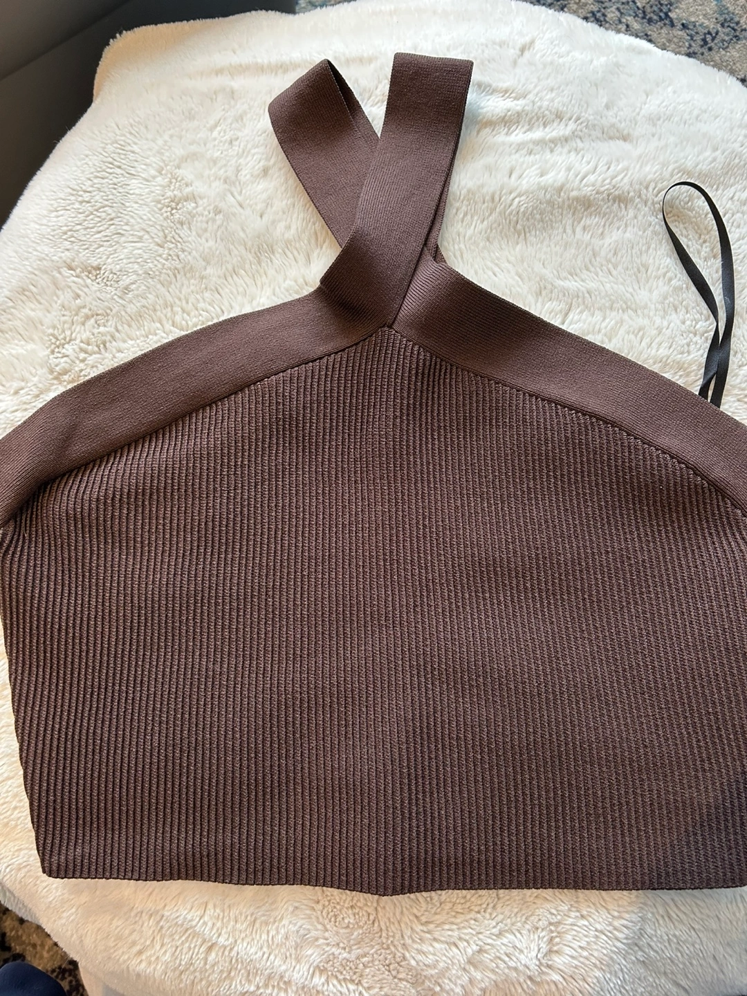 Brown ribbed knit halter top. Size extra-large. Cross-over halter neckline. New no tags condition.