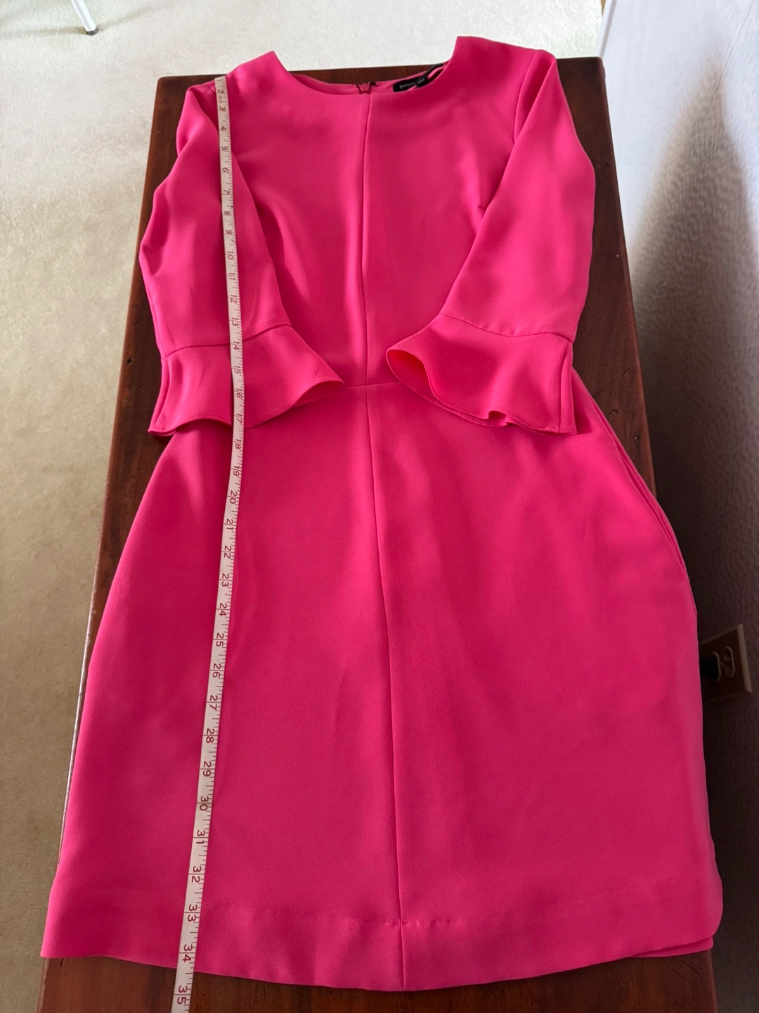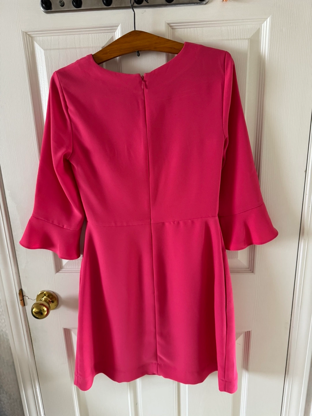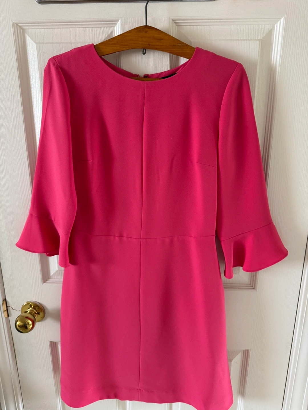Beautiful hot pink dress. Three-quarter sleeves with bell shape. Simple, elegant design. Zipper closure in the back. Great for any occasion.