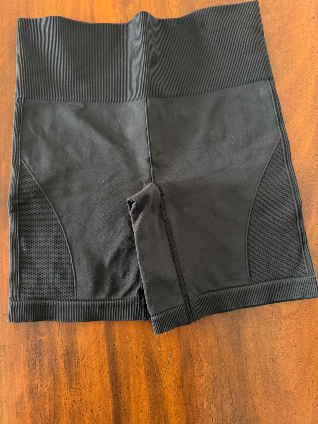 Black seamless shorts. High-waisted, ribbed waistband. Mesh detailing on sides. Excellent for working out or lounging.