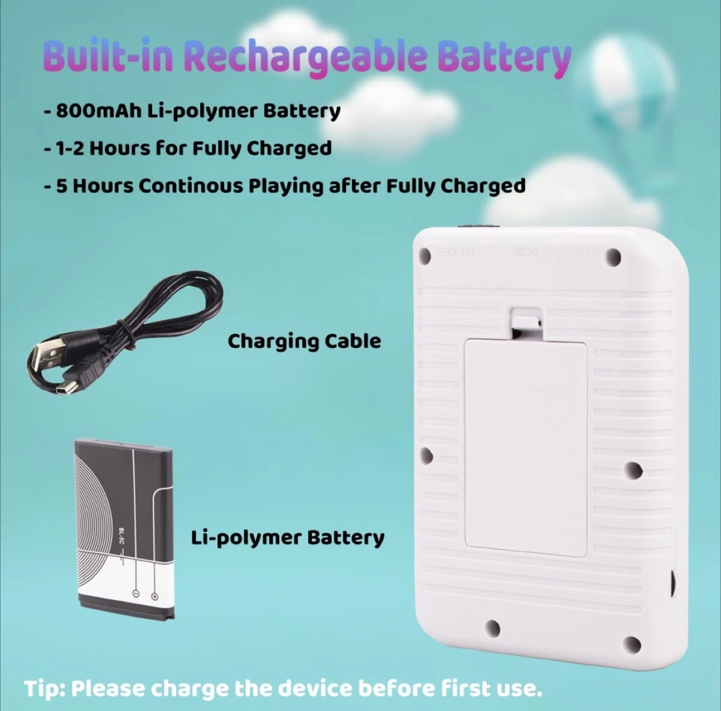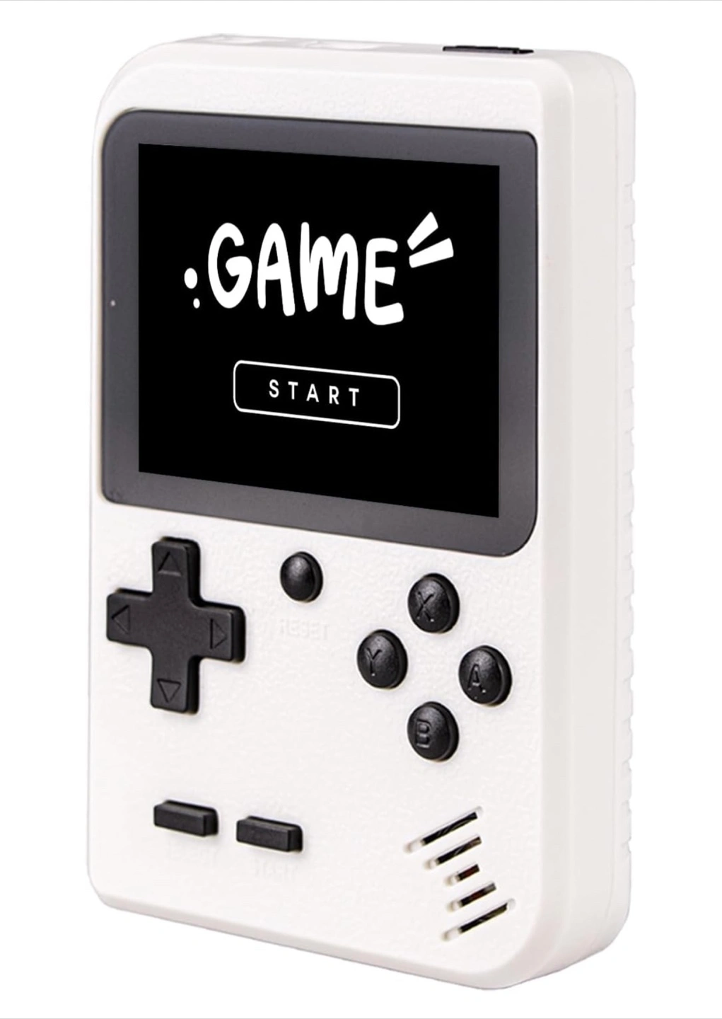 265Portable gaming system. Features a 2.8" colour screen. Includes 400 8-bit games. AV output for TV connection. Rechargeable battery. Includes USB charging cable and AV cable. Compact and lightweight design. Perfect for kids.