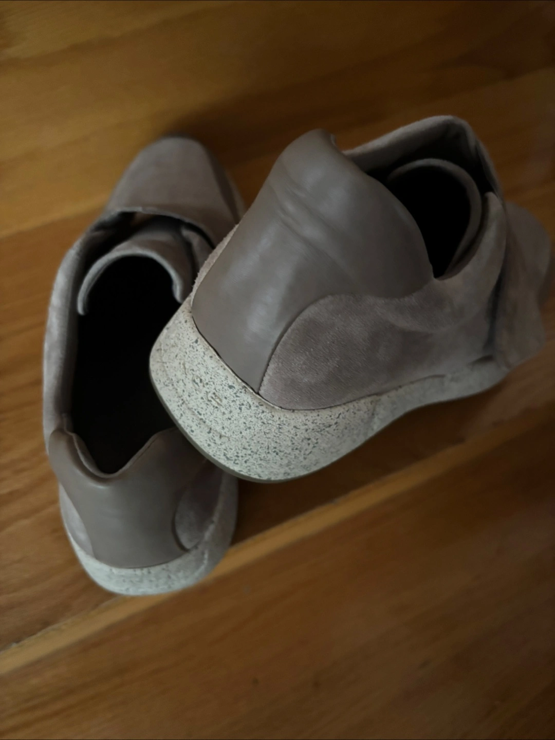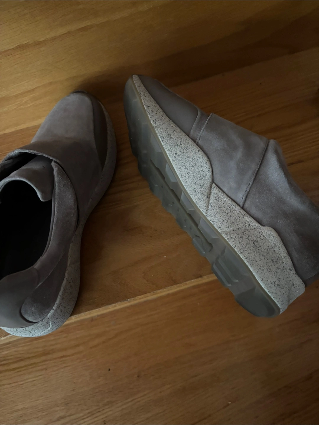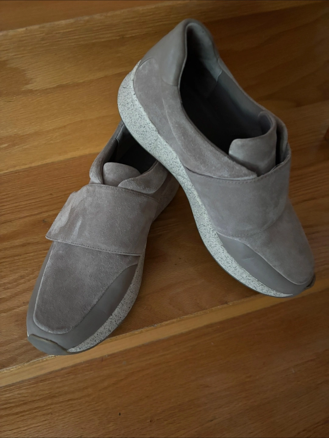 21Pair of women's slip-on sneakers. Grey suede upper. Unique speckled sole. Velcro closure. Casual style.