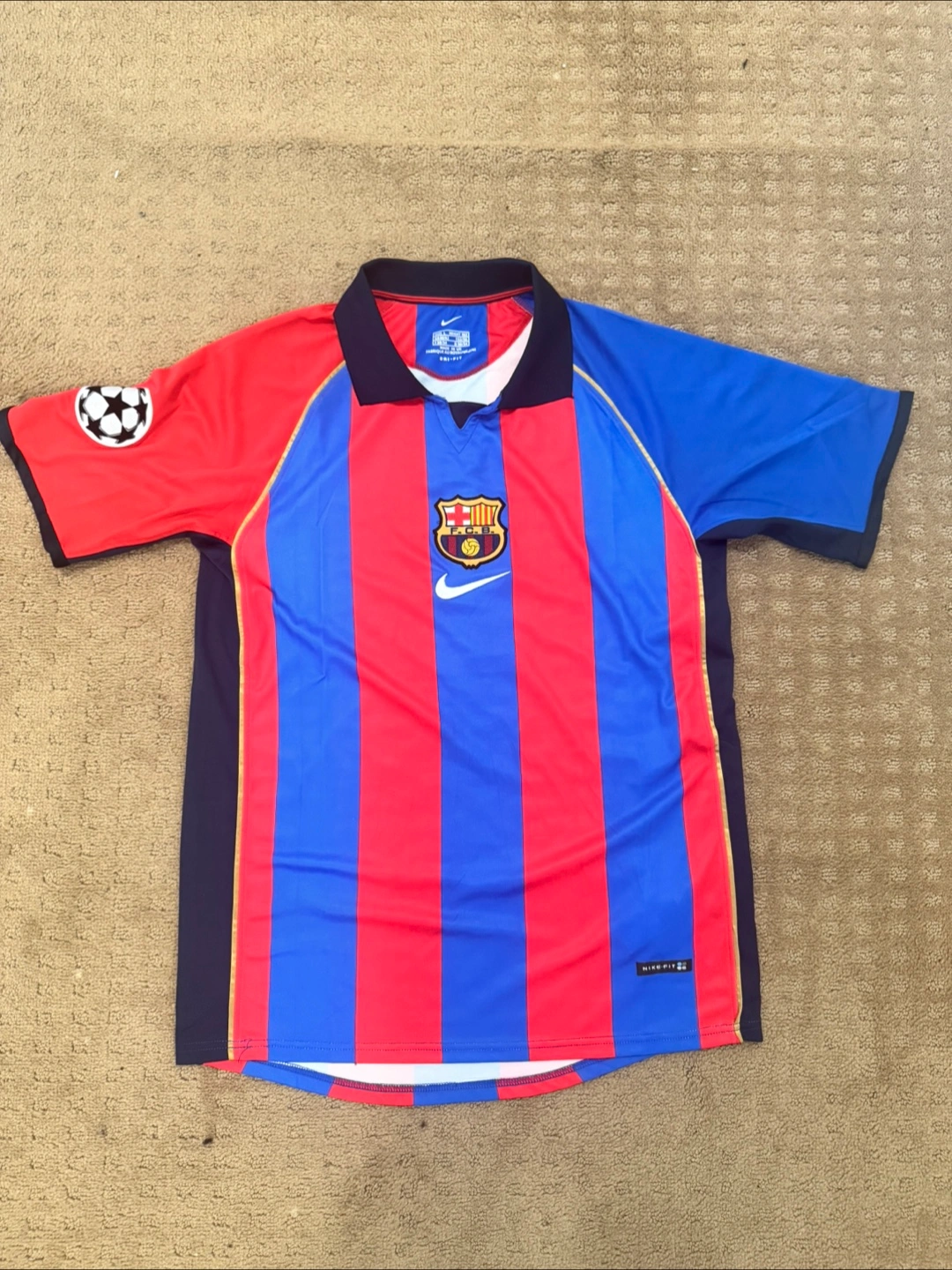 Vintage FC Barcelona jersey. Nike. Red and blue vertical stripes. Champions League badge. Short sleeves. Collared.