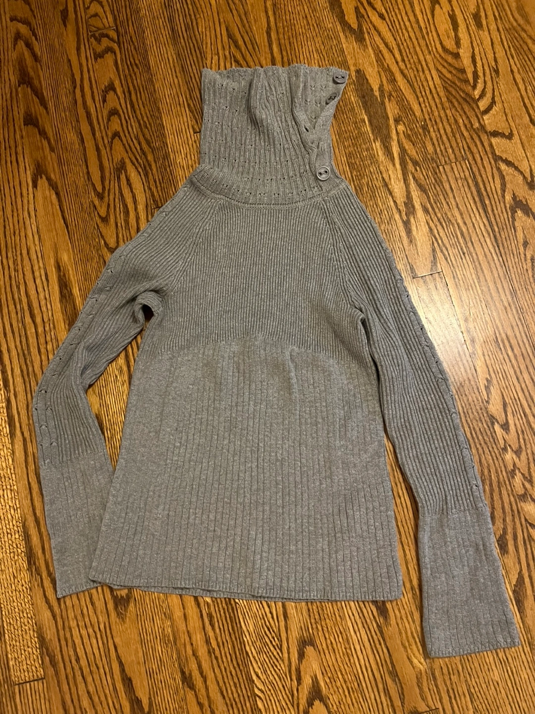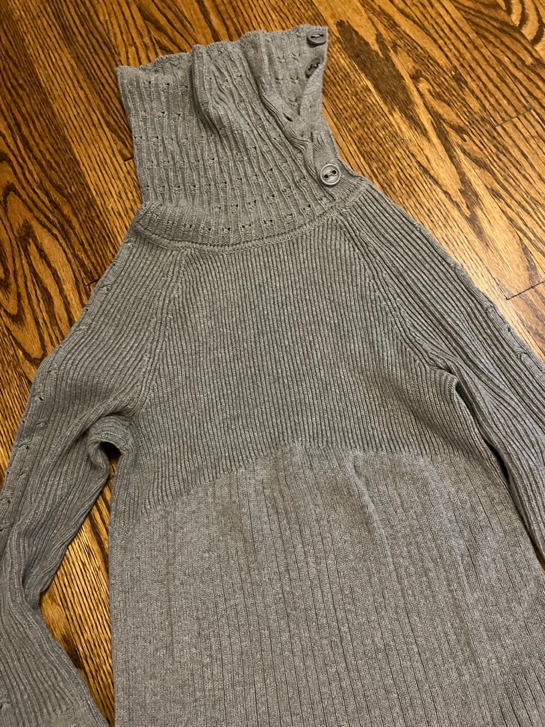 Grey ribbed mock neck sweater. Features a button detail at the collar. Long sleeves. 97% cotton, 3% other fibre.