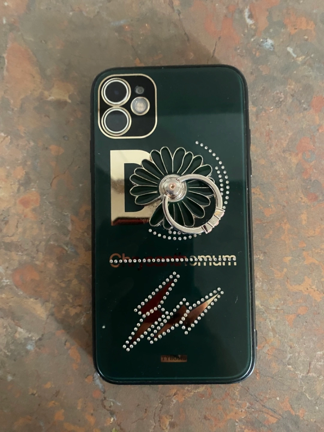 iPhone 11 phone and case. Green phone case features a ring holder and rhinestone accents. White iPhone 11 in good condition. Screen protector included.
