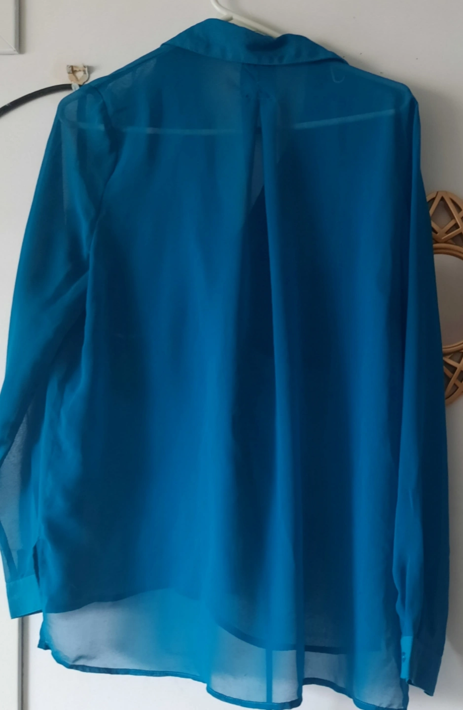 Long-sleeve button-down shirt. Teal blue colour. Sheer fabric. Two chest pockets. Relaxed fit. Great for layering or wearing on its own.