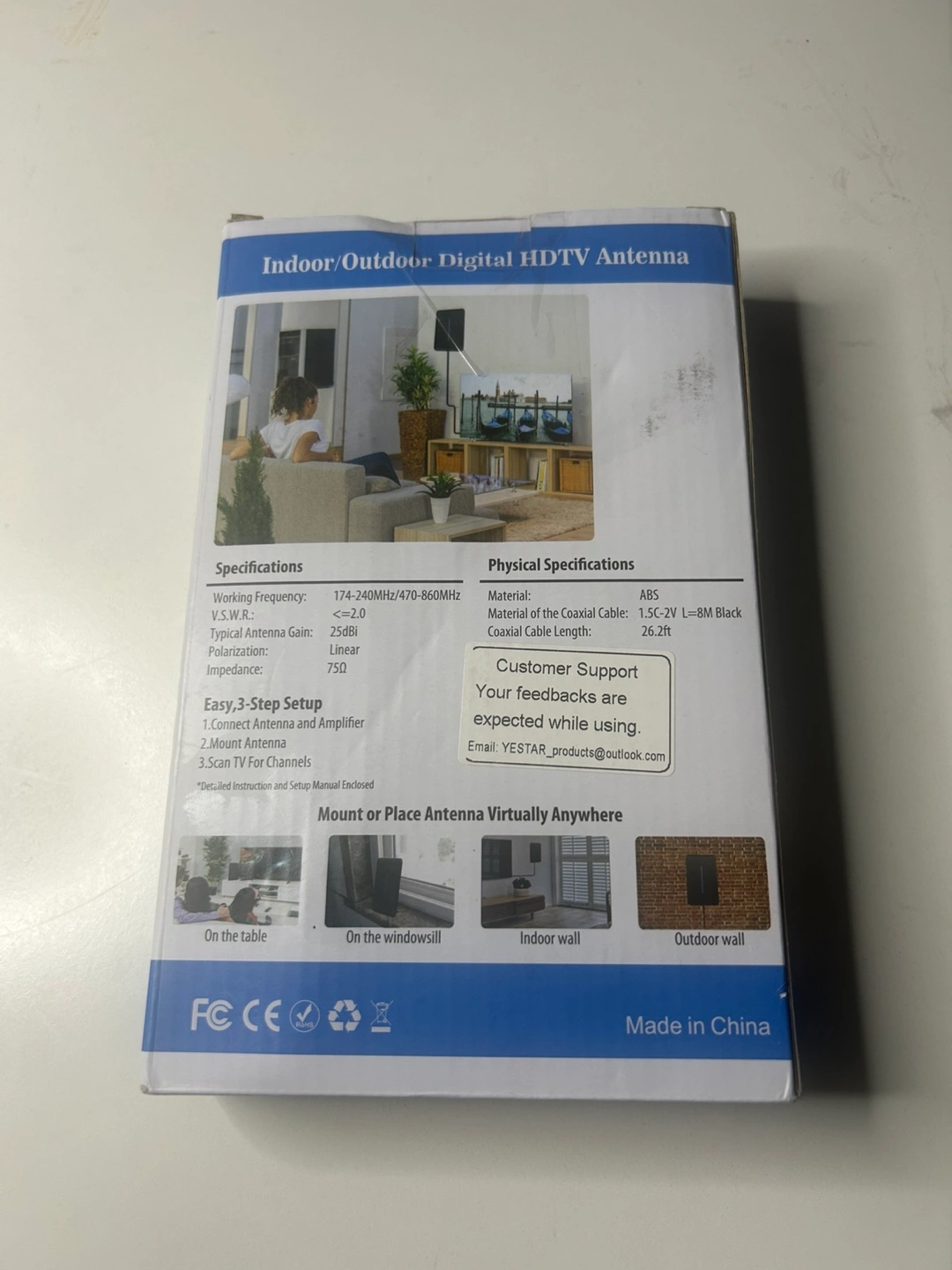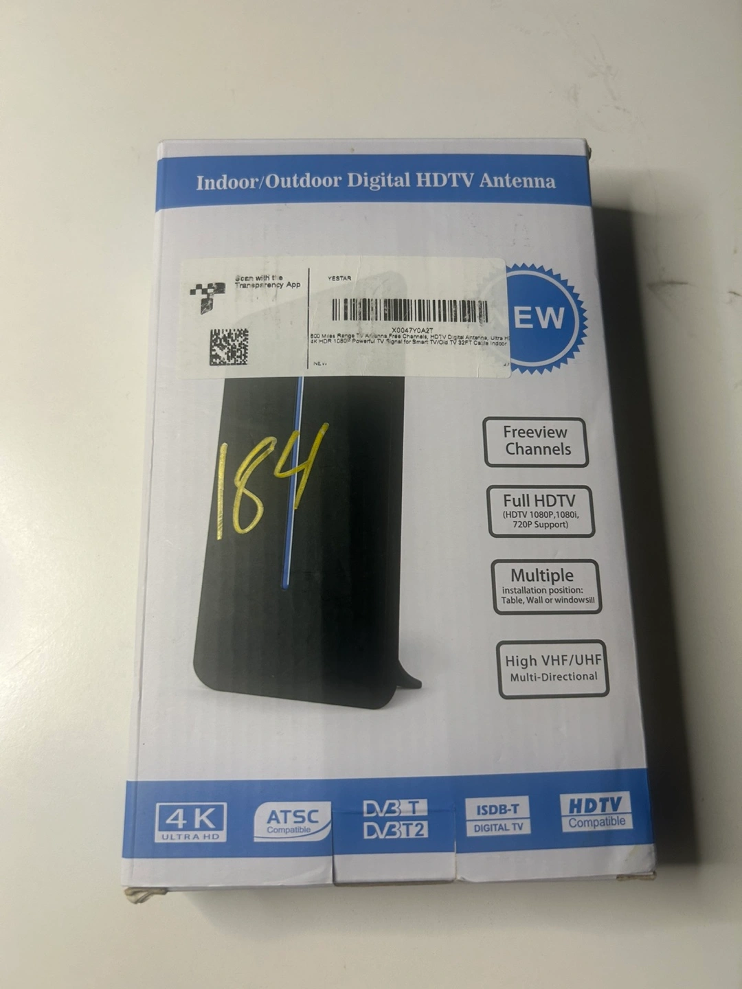 34Digital HDTV antenna for indoor or outdoor use. Receives freeview channels. Full HD (1080p), 720p support. Multiple installation positions: table, wall or windowsill. High VHF/UHF multi-directional. 4K Ultra HD, ATSC, DTV/T2, ISDB-T digital TV compatible.