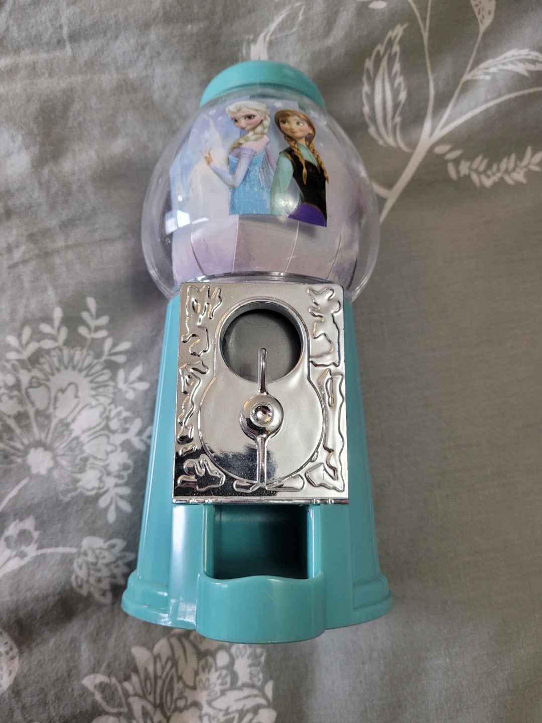 603Miniature gumball machine. Features Elsa and Anna from Disney's Frozen. Teal plastic body with silver accents. Made in China. LOCAL PICK UP IN NORTH YORK ONLY