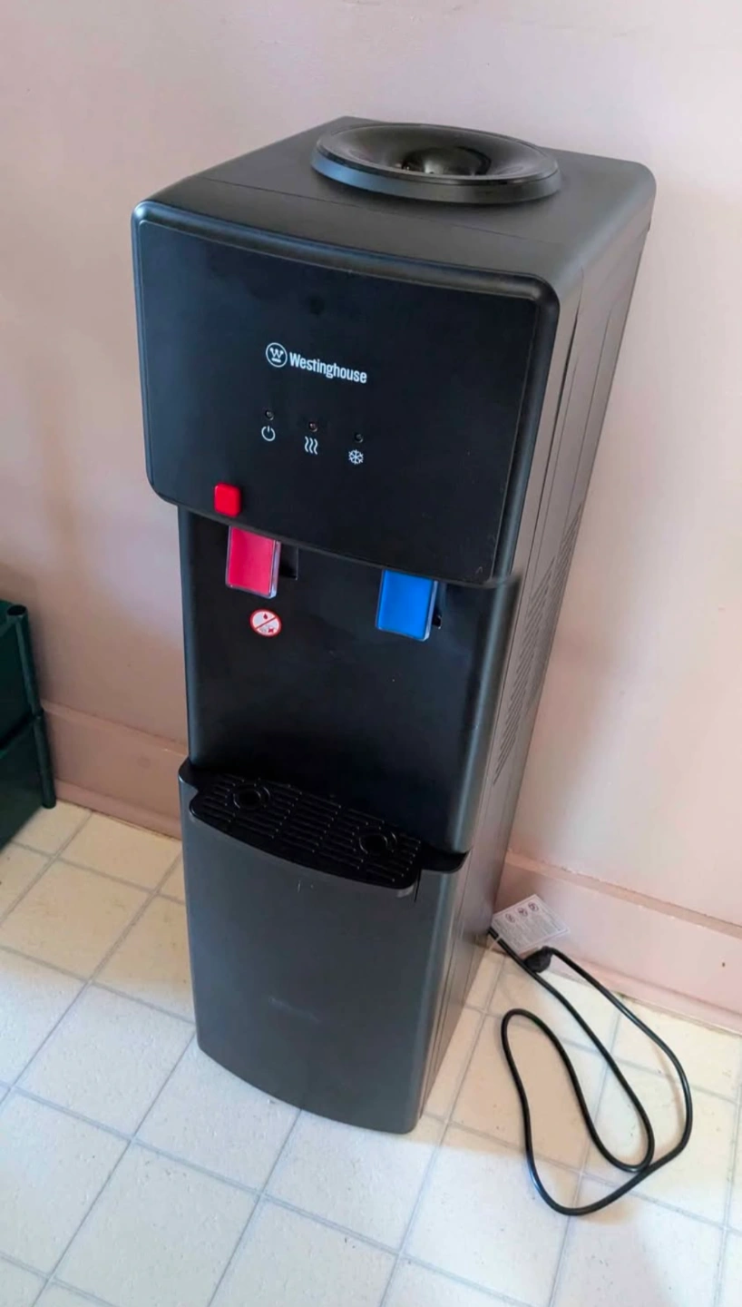 Black water cooler. Top-loading design. Hot and cold water options. Includes power cord. Used for approx a month, it is in excellent condition.