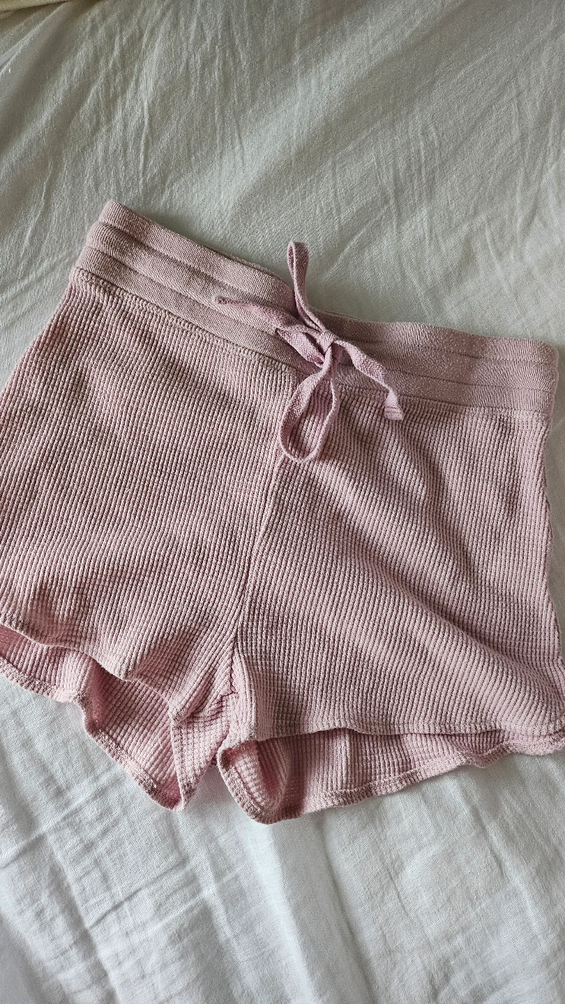 Dusty rose coloured ribbed knit shorts. Drawstring waist. Great for lounging or sleeping.