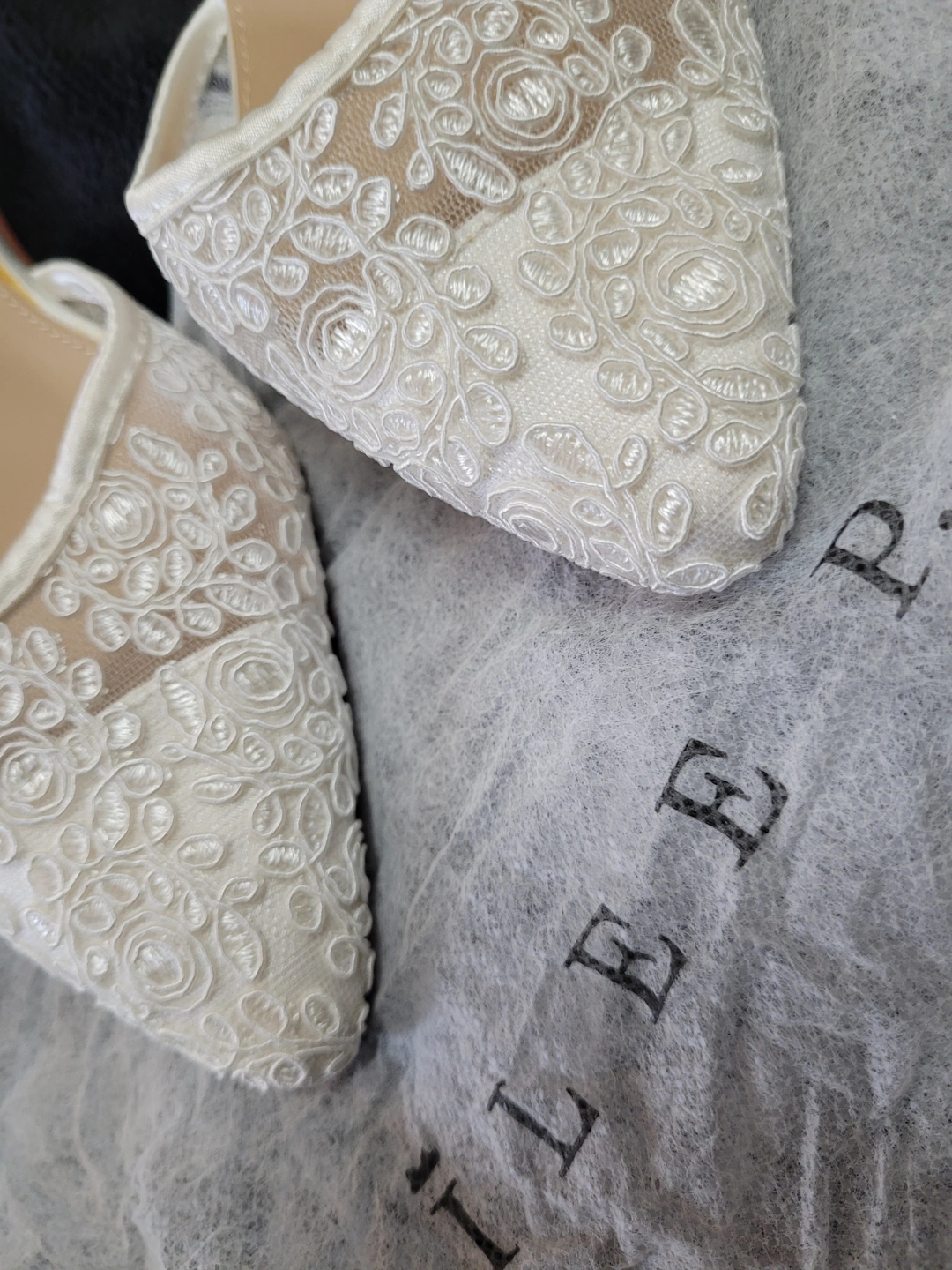 Elegant wedding flats. Delicate floral lace design. Pointed toe. Ankle ribbon detail and straps included. New, unworn condition. Includes dust bag. Retails for $170+Tax.
