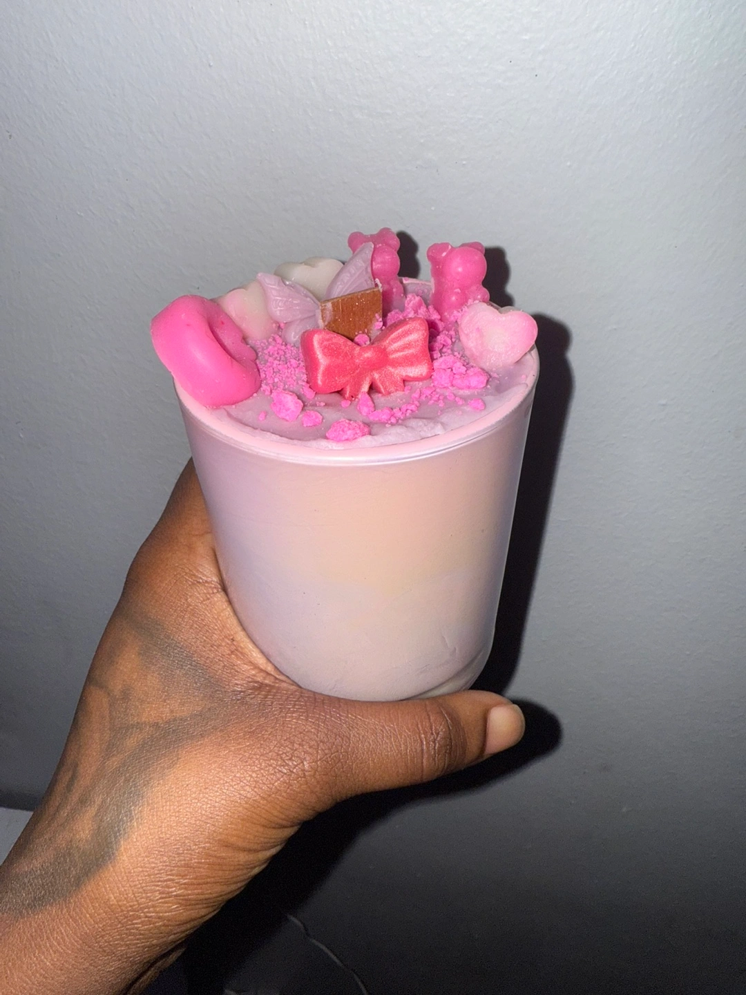 Cute pink scented candle. Topped with gummy candies. Perfect for gifts or personal use. Unique and eye-catching design.