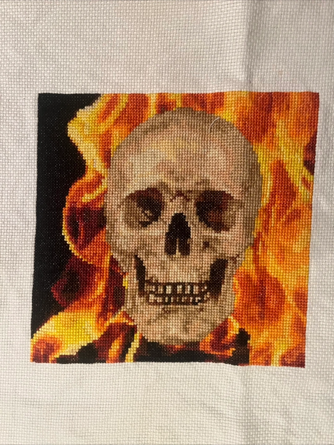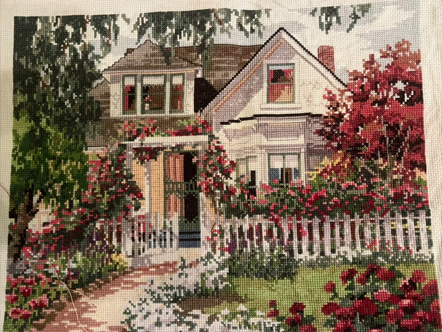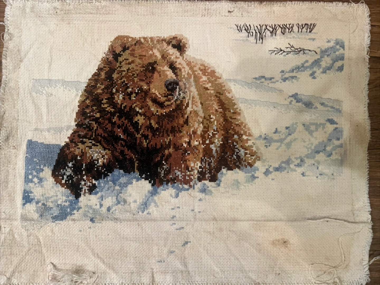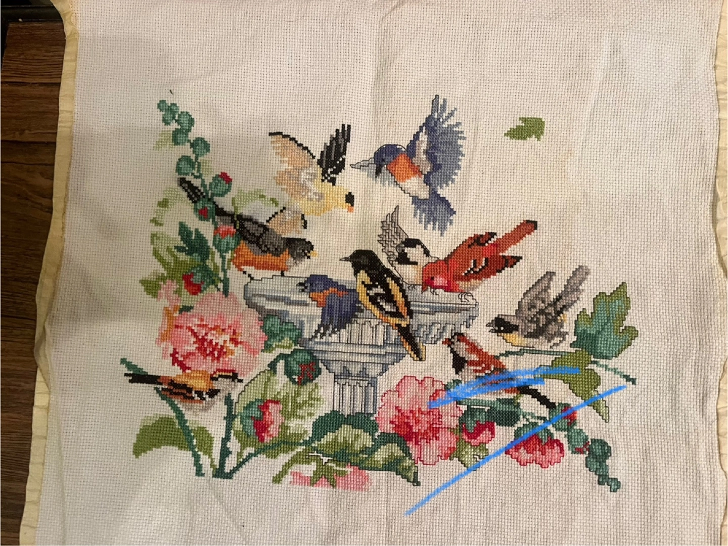 34Five unfinished cross-stitch projects. Various designs including birds at a birdbath, wolves, a house with roses, a bear in the snow, and a skull engulfed in flames. All on Aida cloth. Some fraying at edges.message for prices