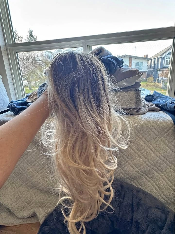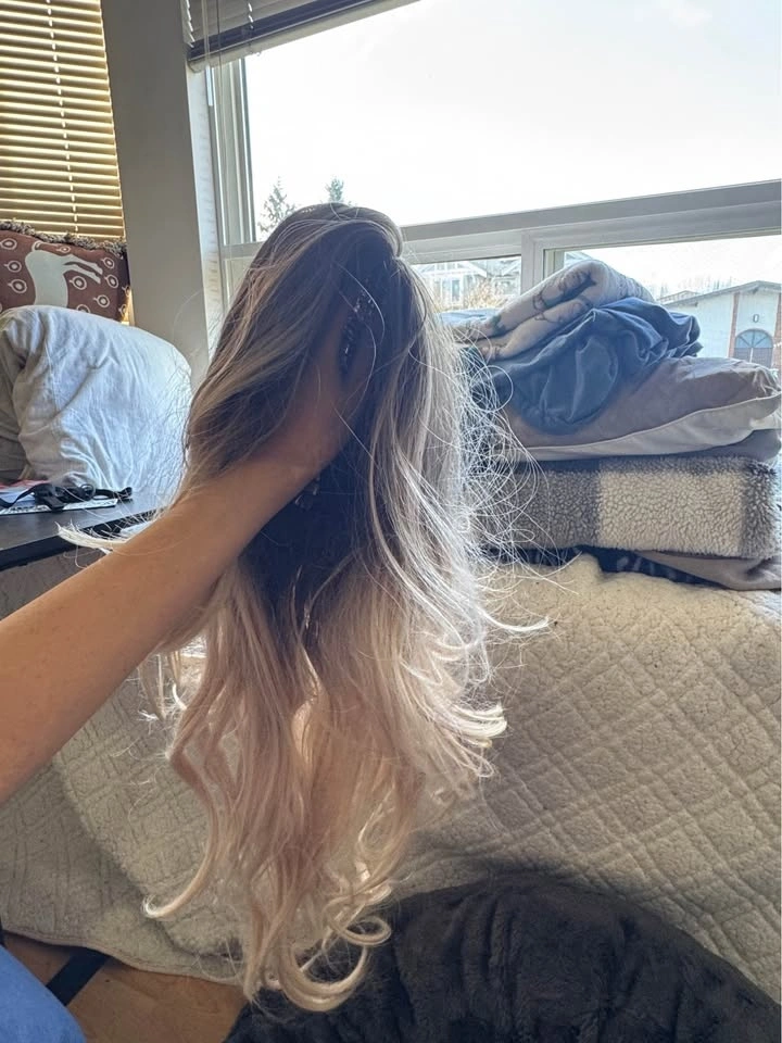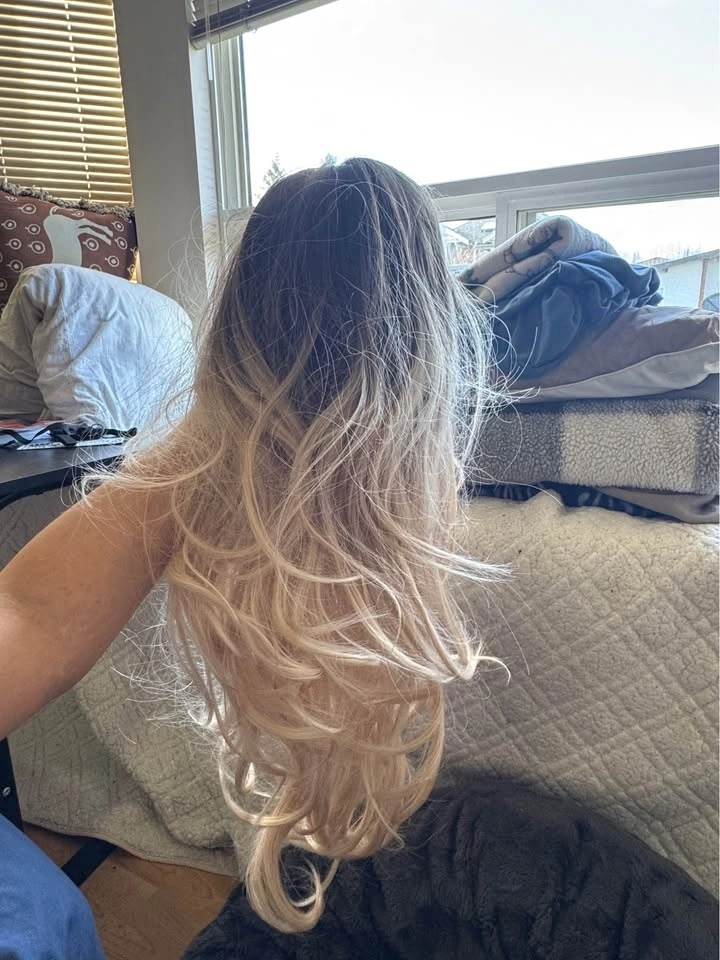 Long, synthetic-style wig with a dark rooted, blonde ombre and loose curls. Only worn once for Halloween. Super new and in great condition.