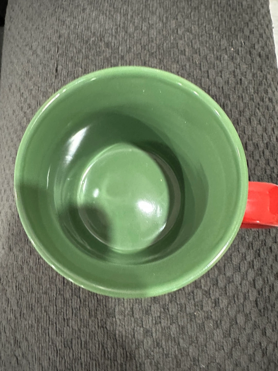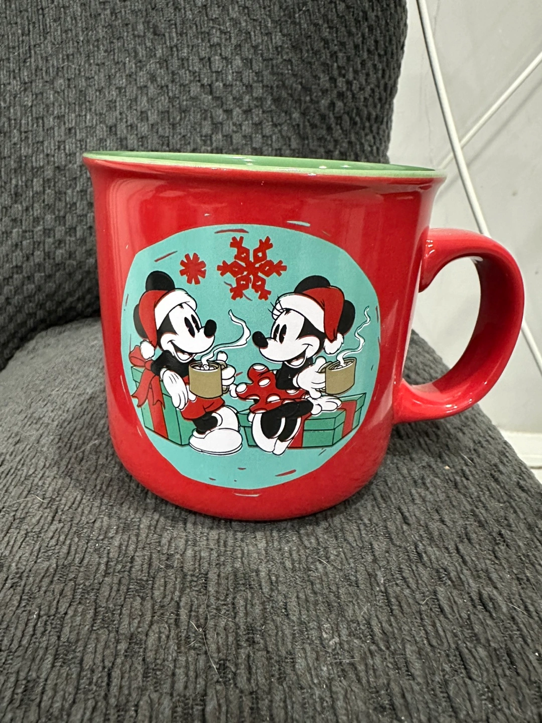 Large ceramic mug. Features Mickey and Minnie Mouse in Santa hats enjoying a warm beverage. Red exterior, green interior.