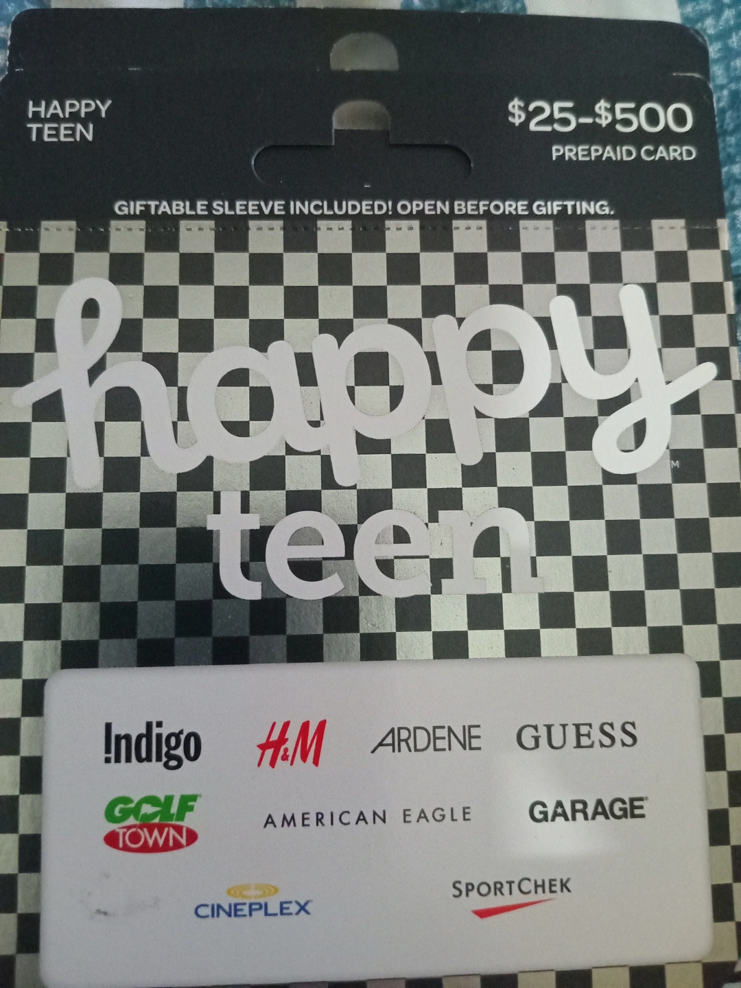 $50 Prepaid Happy Teen gift card Valid at Indigo, H&M, Ardene, Guess, American Eagle, Garage, Golf Town, Cineplex, and Sport Chek will trade for other Gift Cards of equal value $50 if you are purchasing than $40