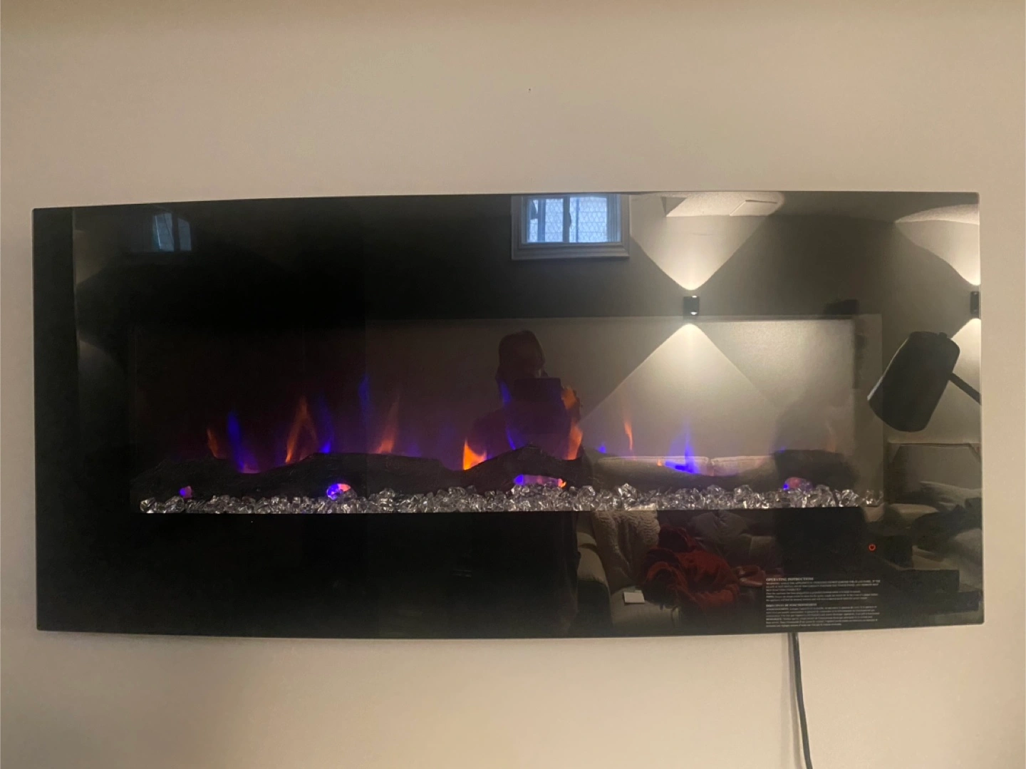 Modern electric fireplace. Wall mounted. Features realistic flame effect. Includes crystals. Black frame.