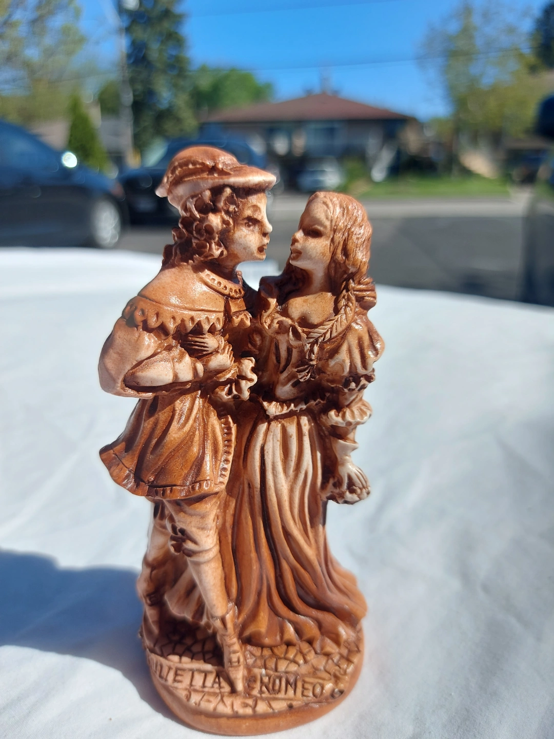 Capture the romance of classic literature with this used Romeo and Juliet figurine, a charming piece that brings a touch of vintage artistry to any space. This figurine depicts the iconic Shakespearean lovers in a warm, earthy tone, perfect for collectors or as a decorative accent. Please note that, as a used item, it carries a history and character that new items simply cannot match.