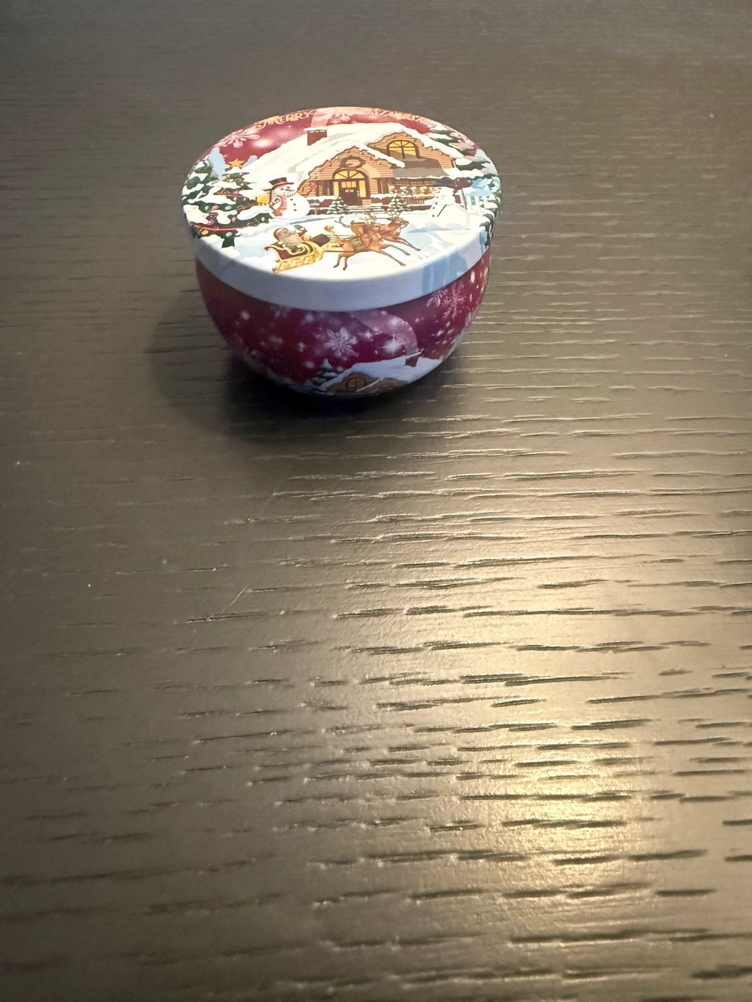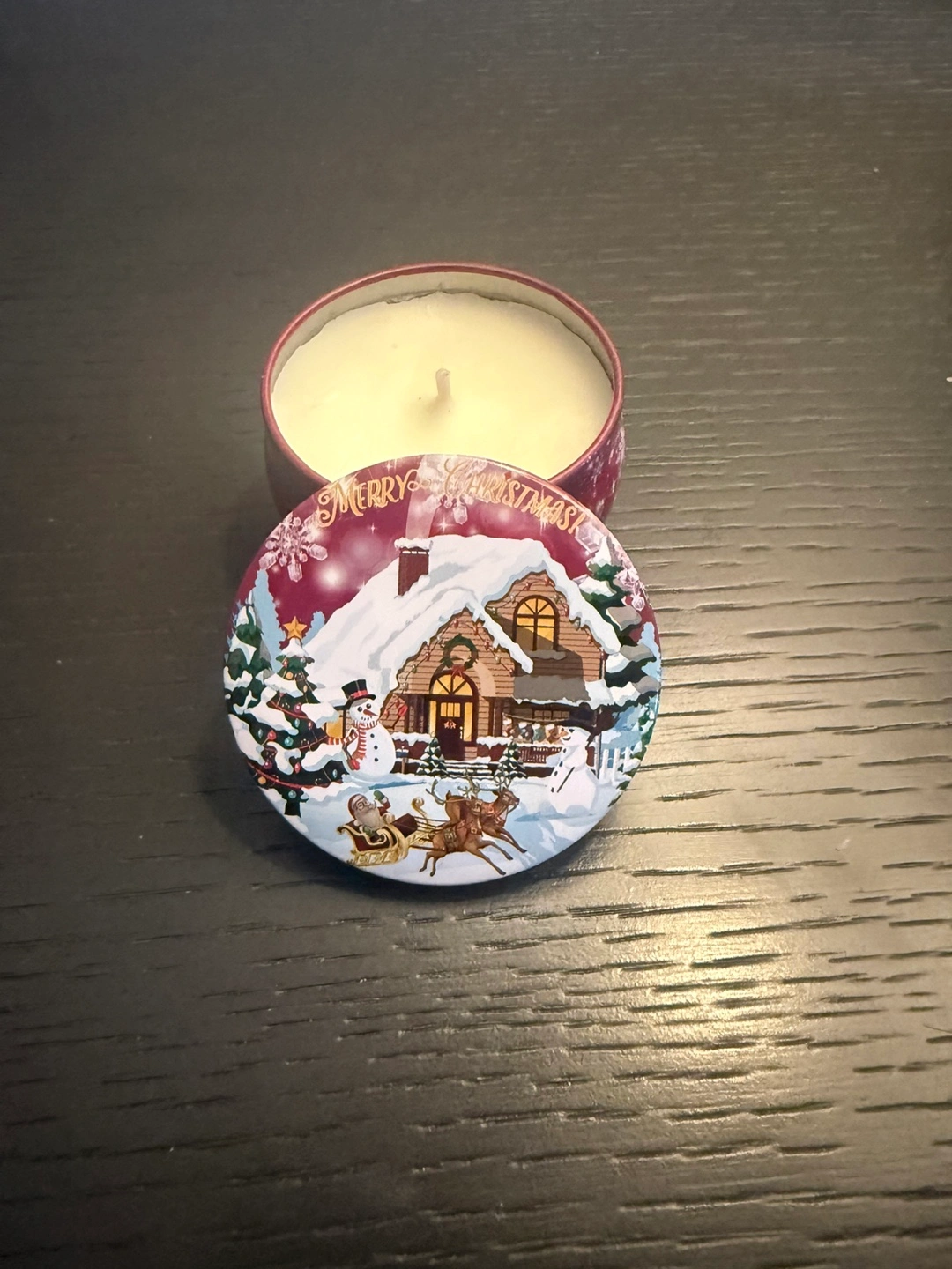 692Small Christmas candle in a reusable tin. Winter scene on the lid. Merry Christmas written on the tin. Perfect for gift-giving or holiday decor.