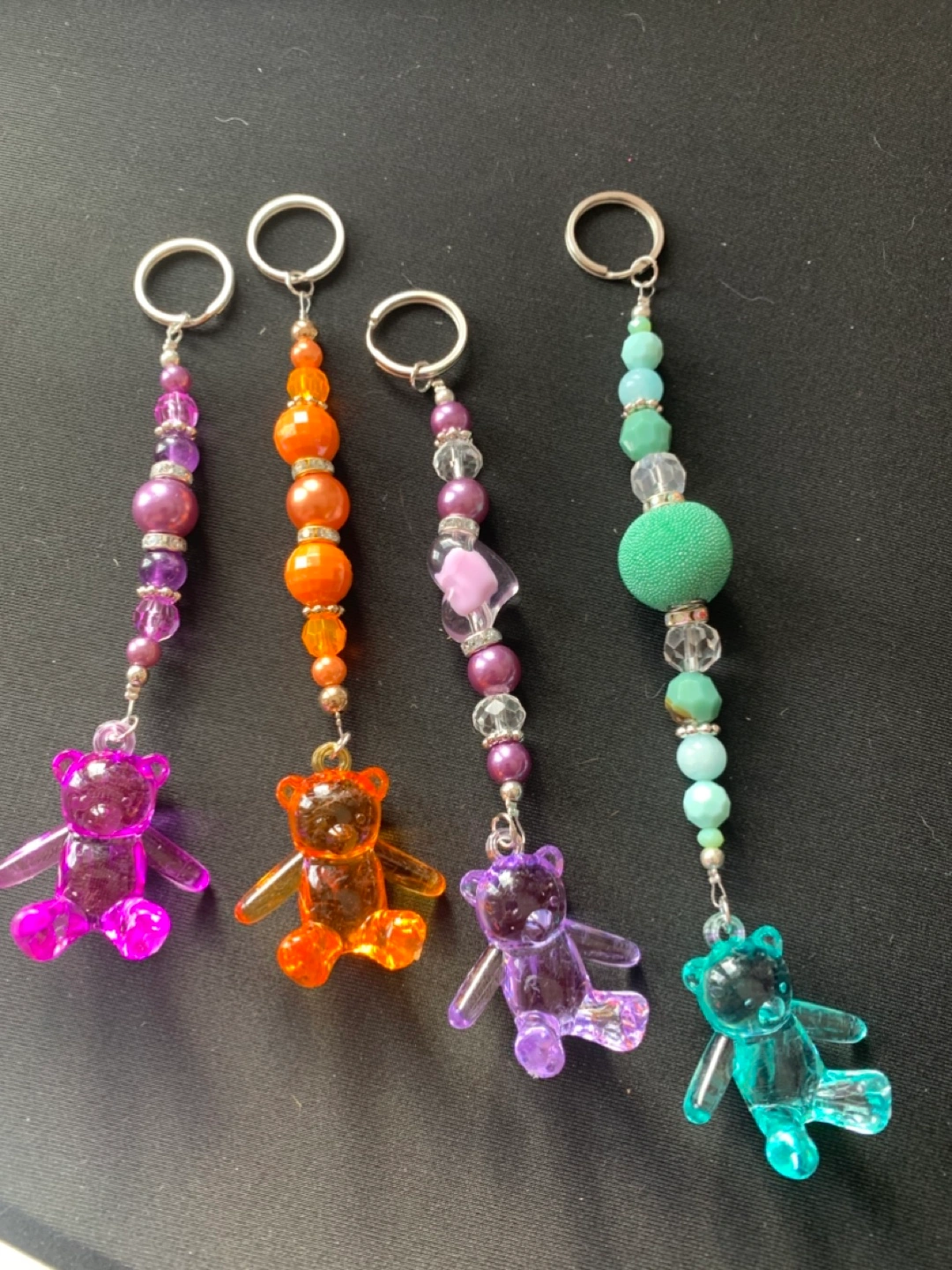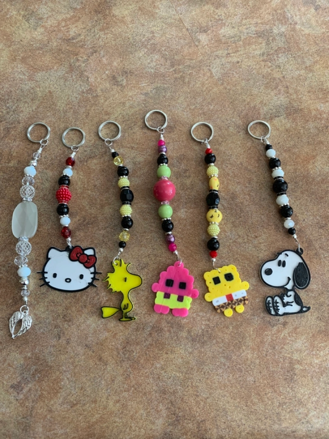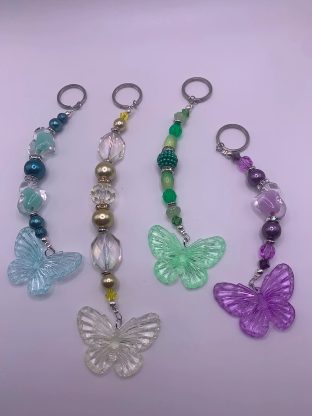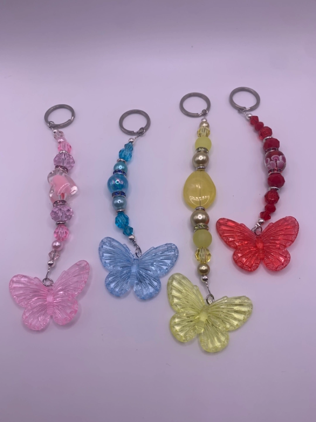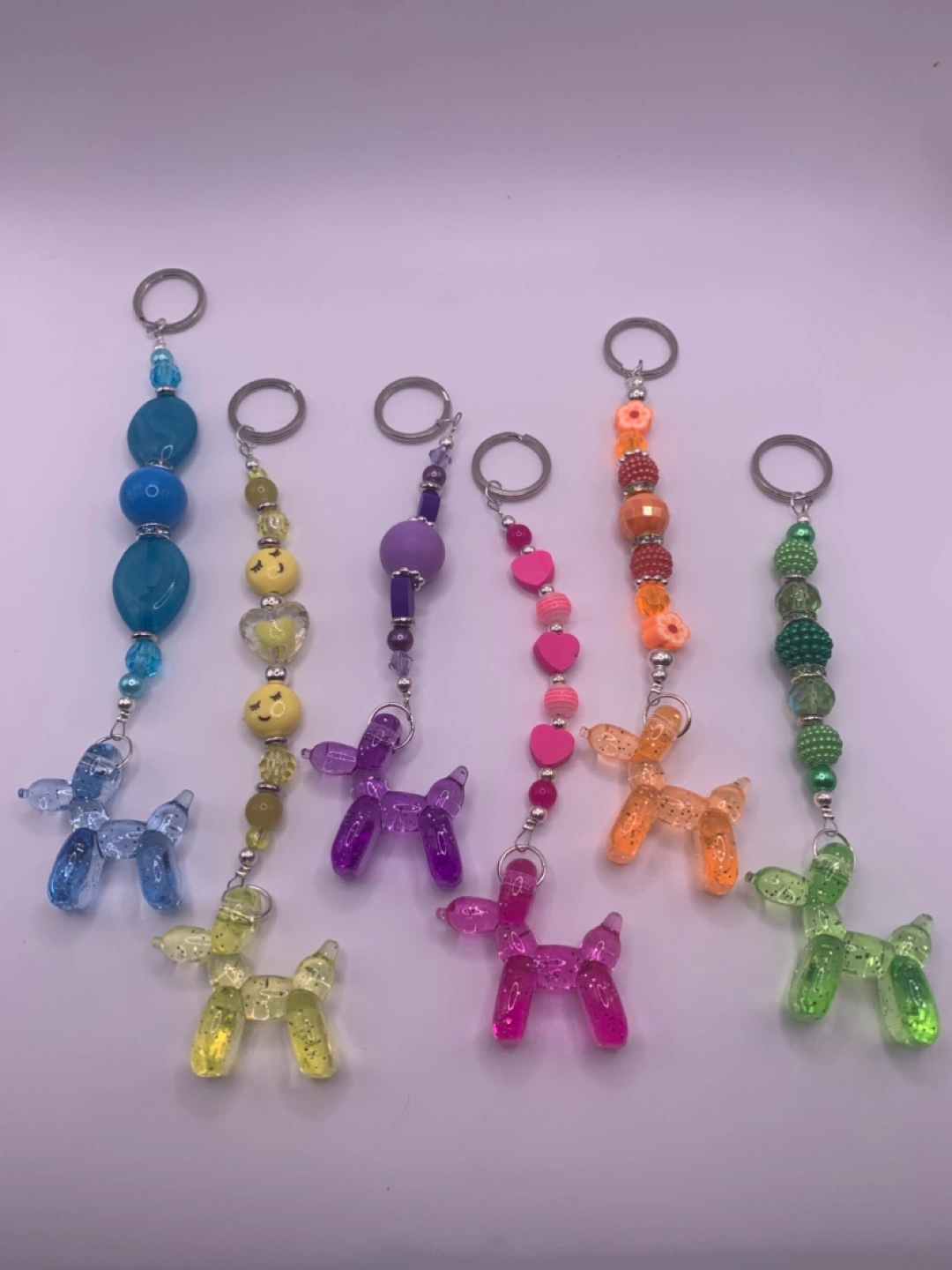 Cute and colourful beaded keychains. Features various charms including butterflies, balloon dogs, cartoon characters, and teddy bears. Perfect for adding a pop of colour to your keys or bag.