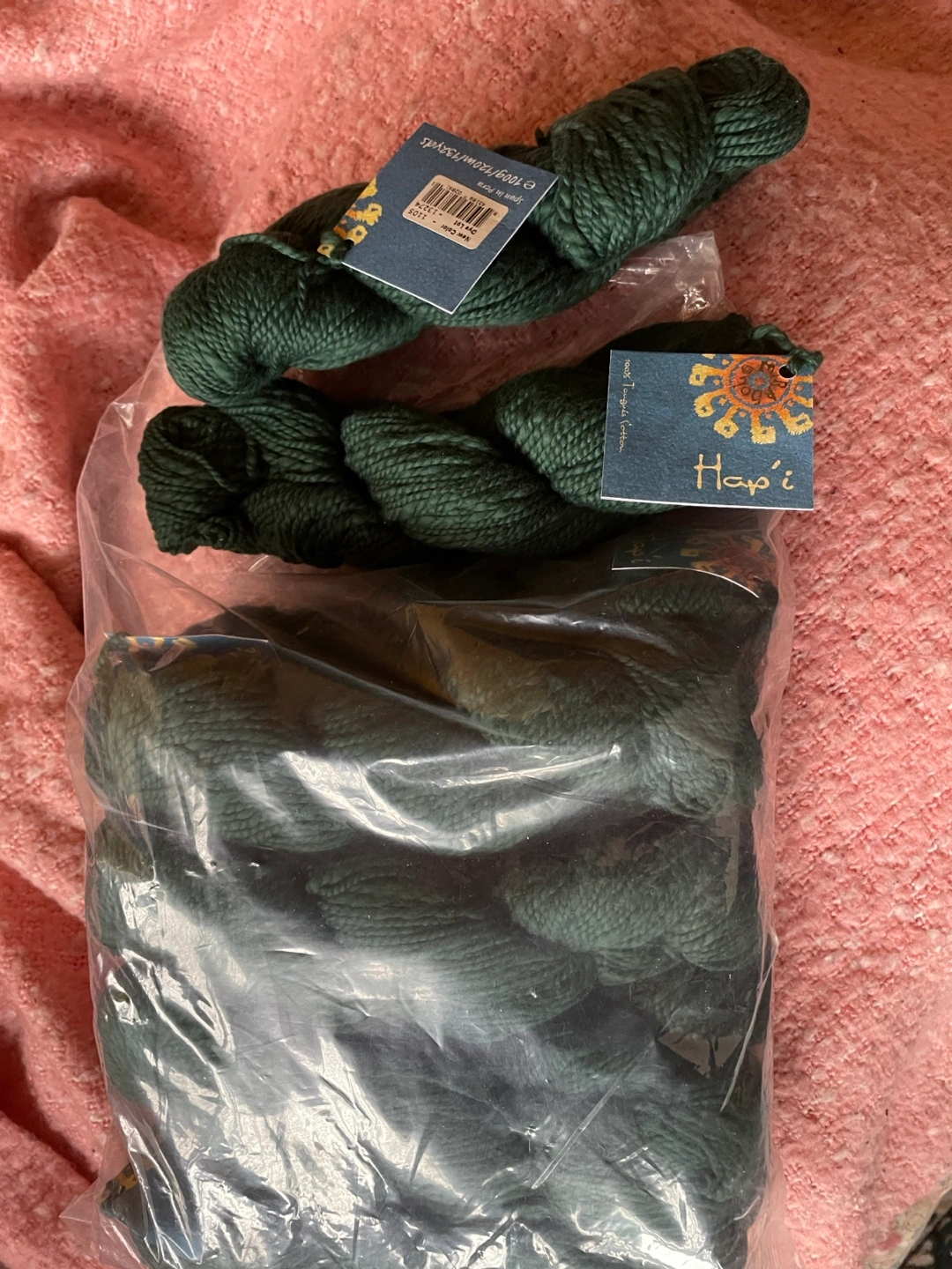 Ten skeins of Hapí 100% Peruvian cotton yarn. This is a very high grade yarn. 🧶 Deep forest blue/green colour. 🌳 Perfect for knitting or crocheting.