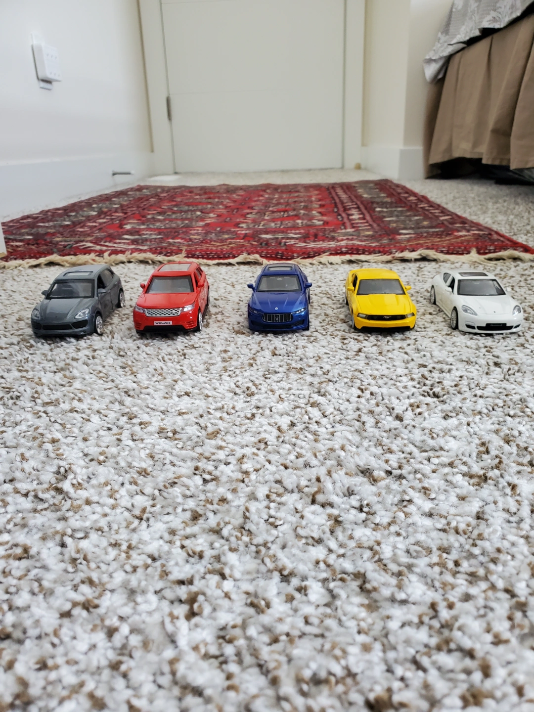 Collection of five miniature toy cars. Includes Porsches, Range Rover Velar, Maserati, Ford Mustang. Great for collectors or children.