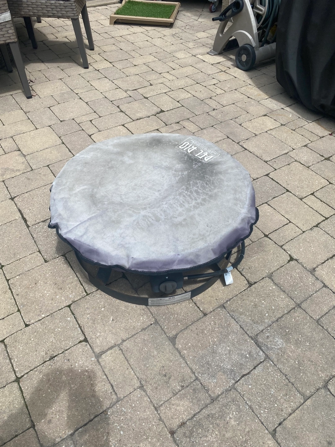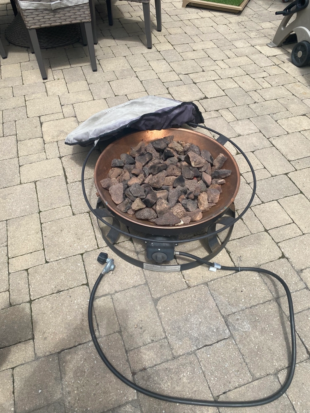 Round propane fire pit. Includes lava rocks and a protective cover. Black metal frame. Copper coloured bowl. Hose and regulator included.