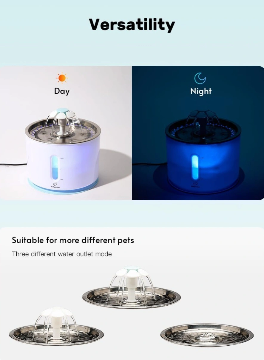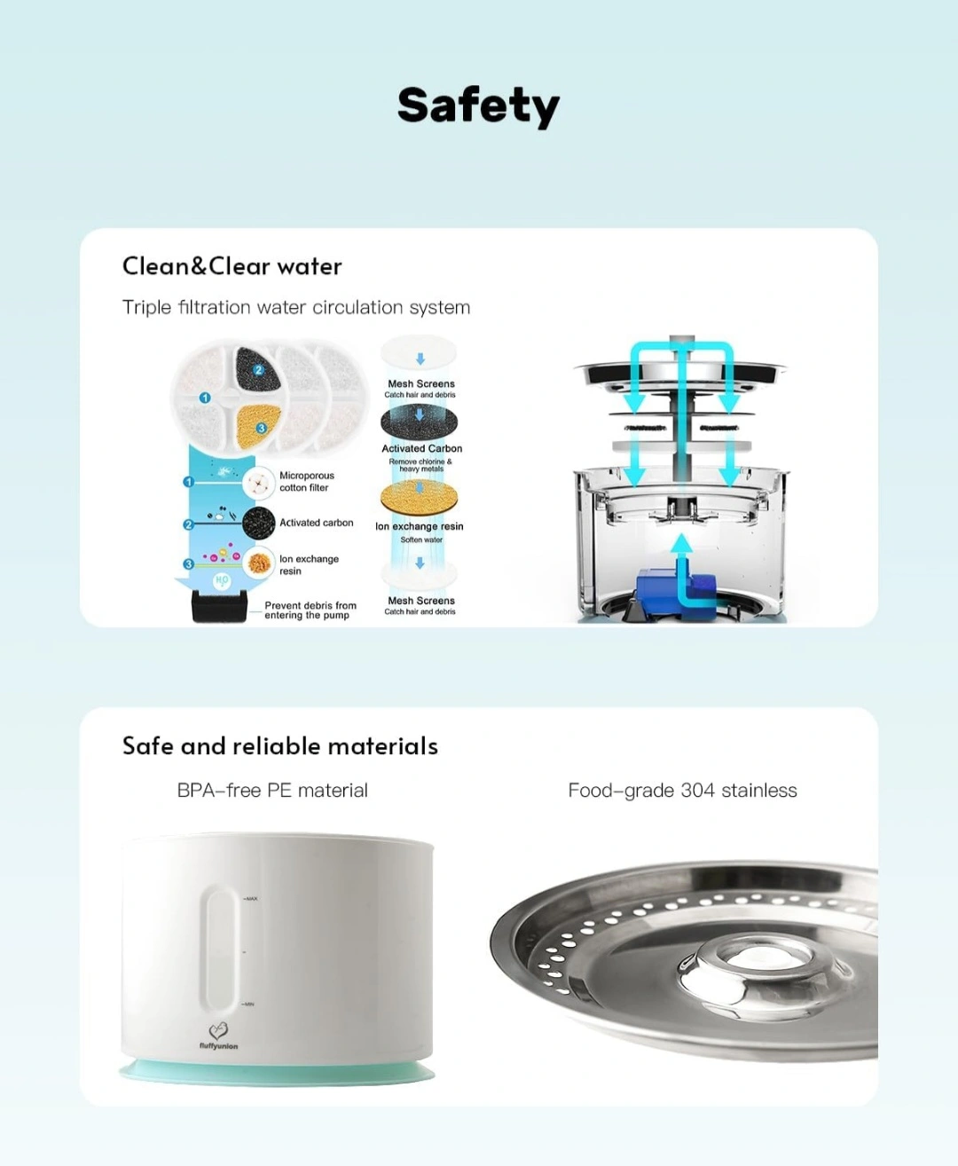 The pet fountain only takes a few minutes to set up. Disassembling for cleaning and maintenance is easy. BPA free pet fountain is safe for your pets.